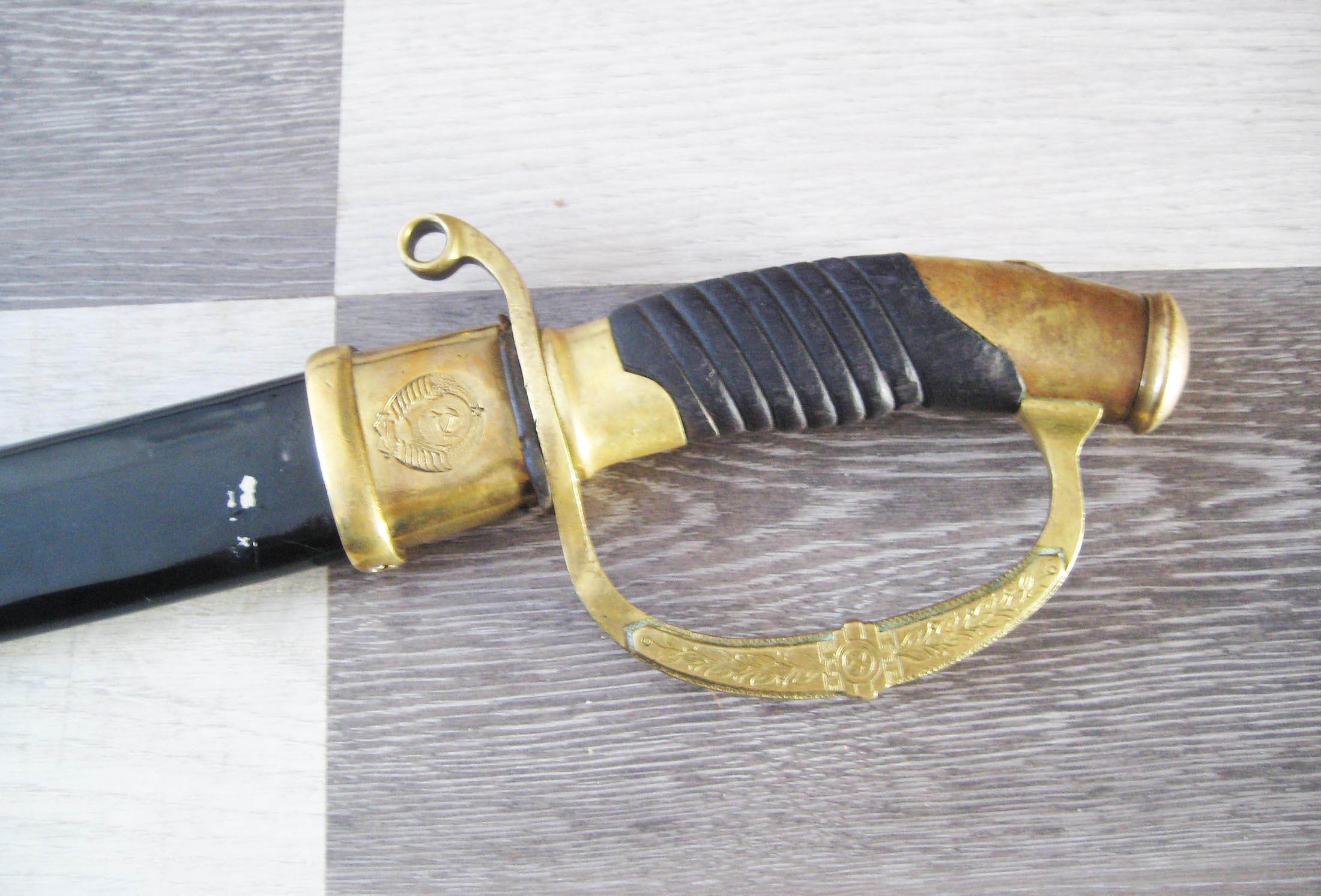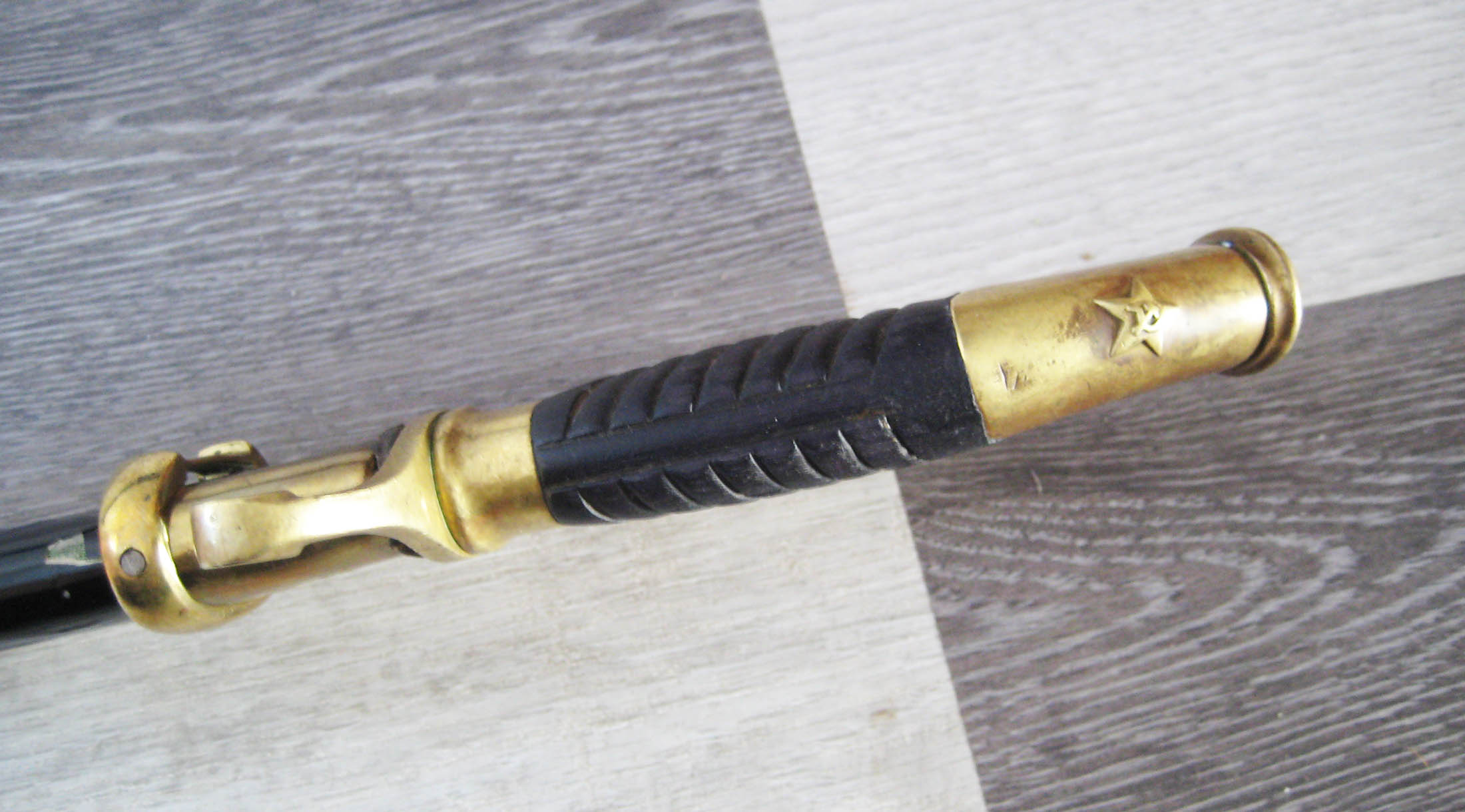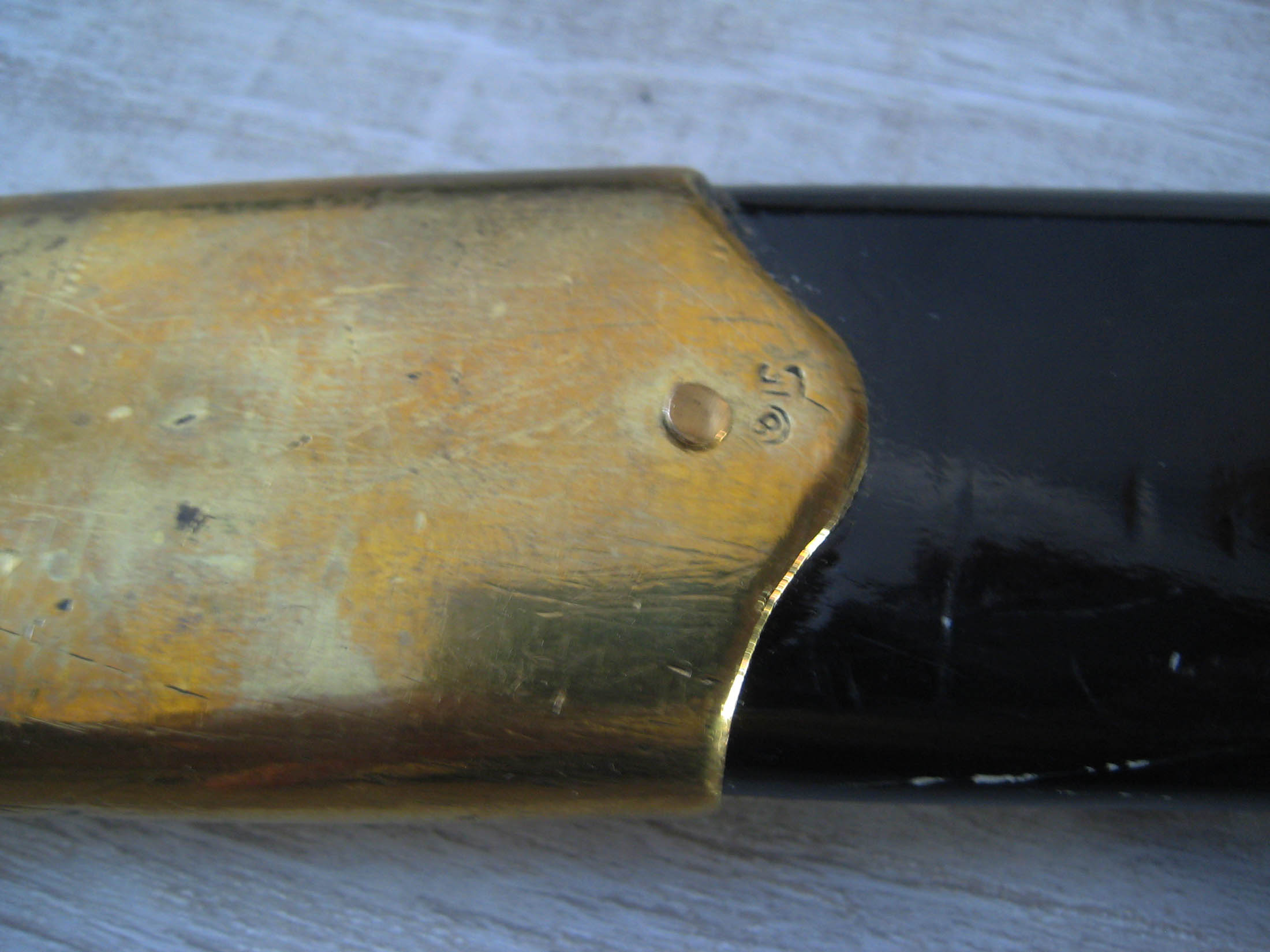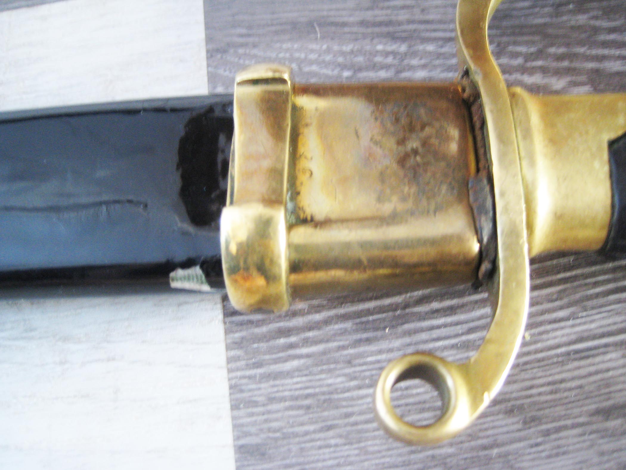 По РФ. Не разбирал. Какой год не знаю. Из недостатков - пытались наточить. Устье ножен - трещинка. Клейма на месте, ржавчины нет, ножны без особых потерь.