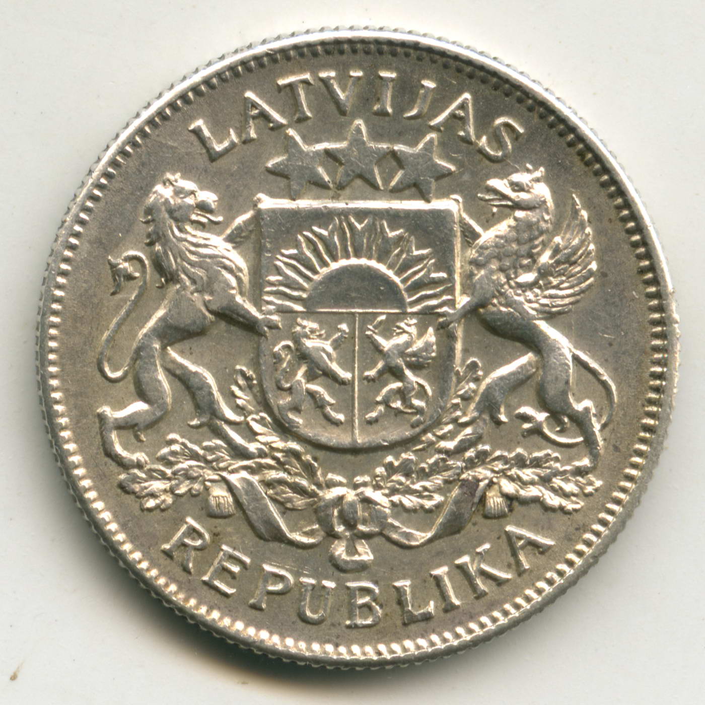 Состояние отличное. Латвия - 1-я республика. Серебро (835 проба, вес 10 грамм, диаметр 27 мм). Регулярный чекан, тираж 6 385 531 шт.