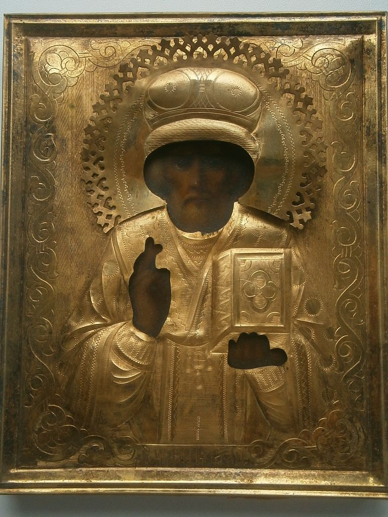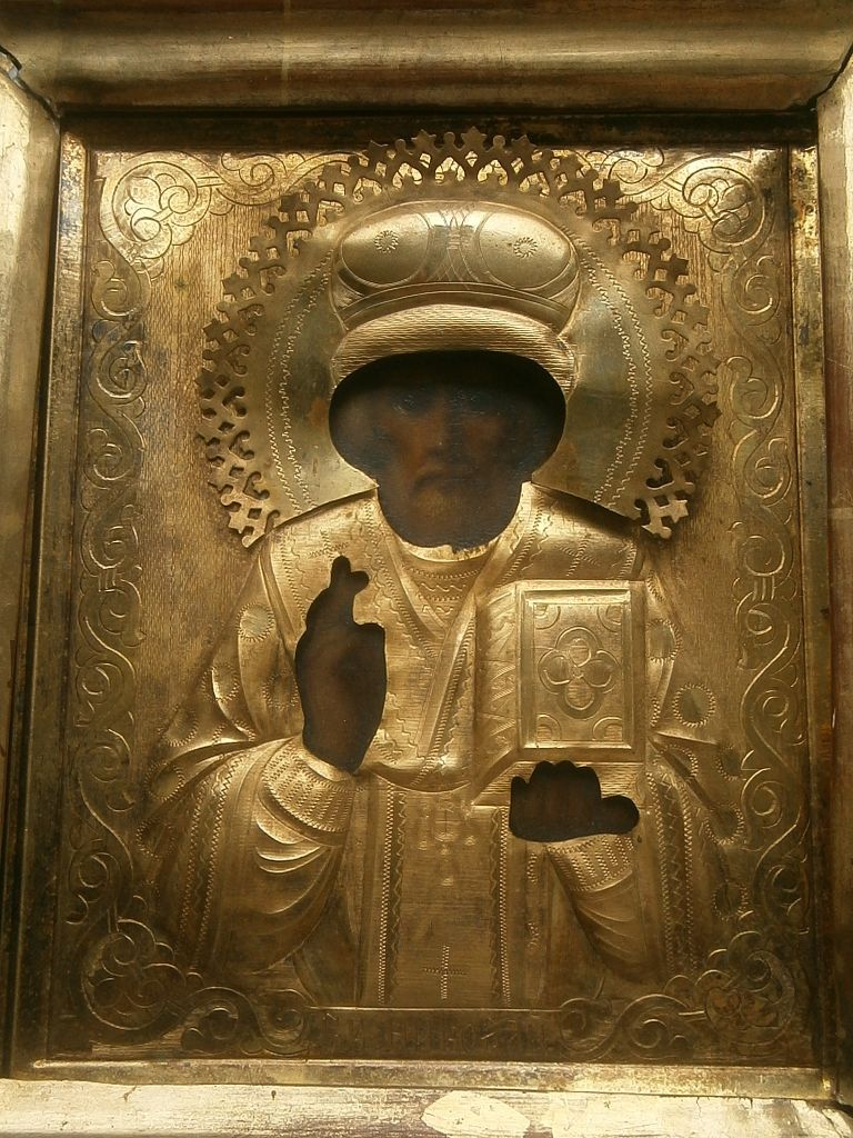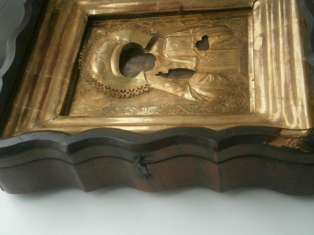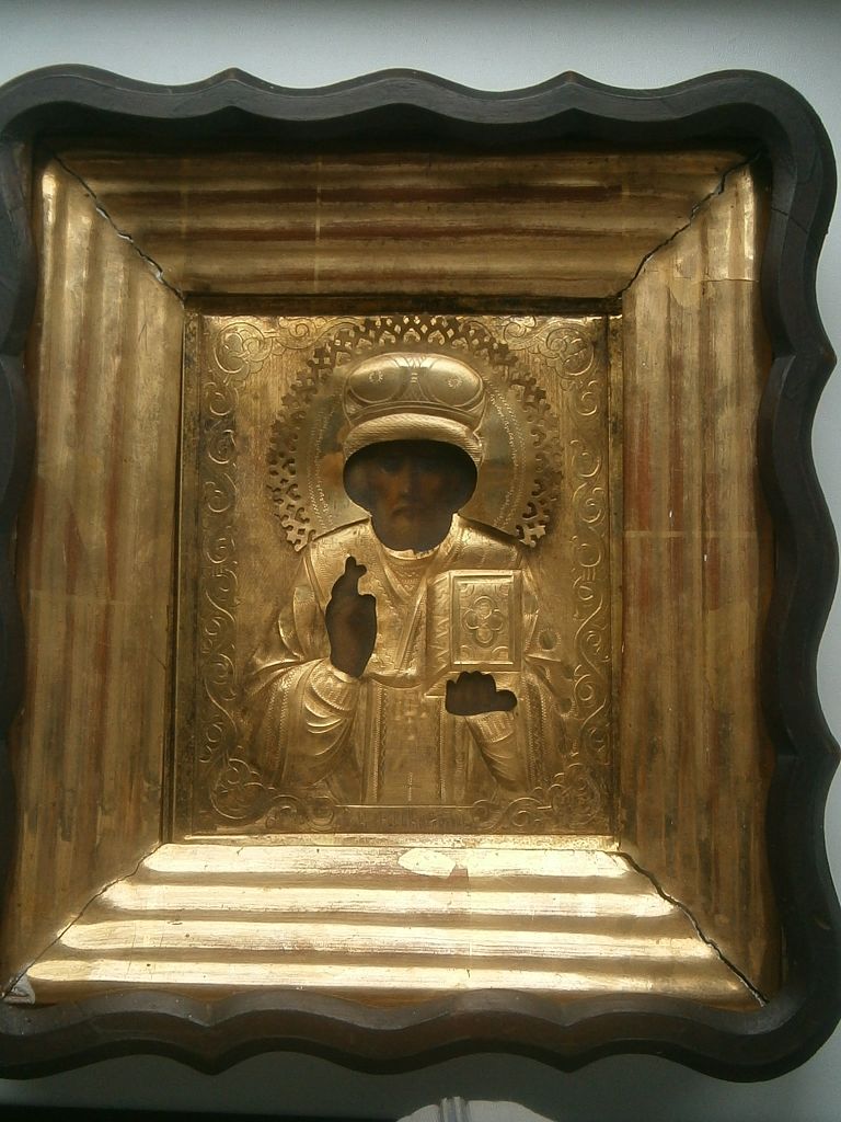 Св. Николай Чудотворец, оклад - бронза позолоченная, киот. В отличном состоянии , позолота горит. Венчик с правой стороны нужно подпаять. Размер иконы 18*14,5см. Размер оклада 29*26см. Стекла нет.