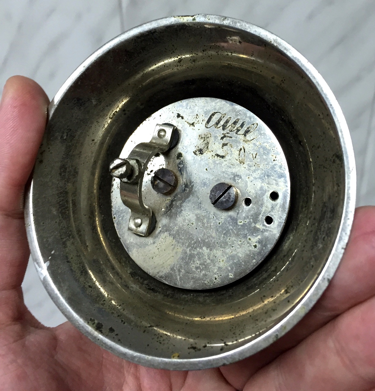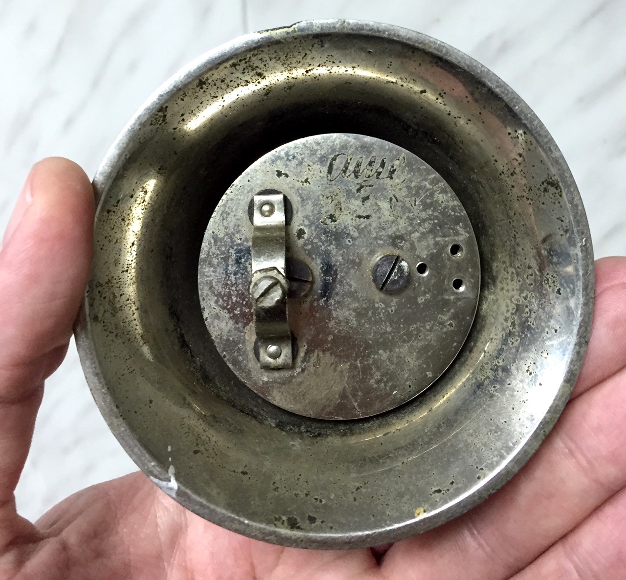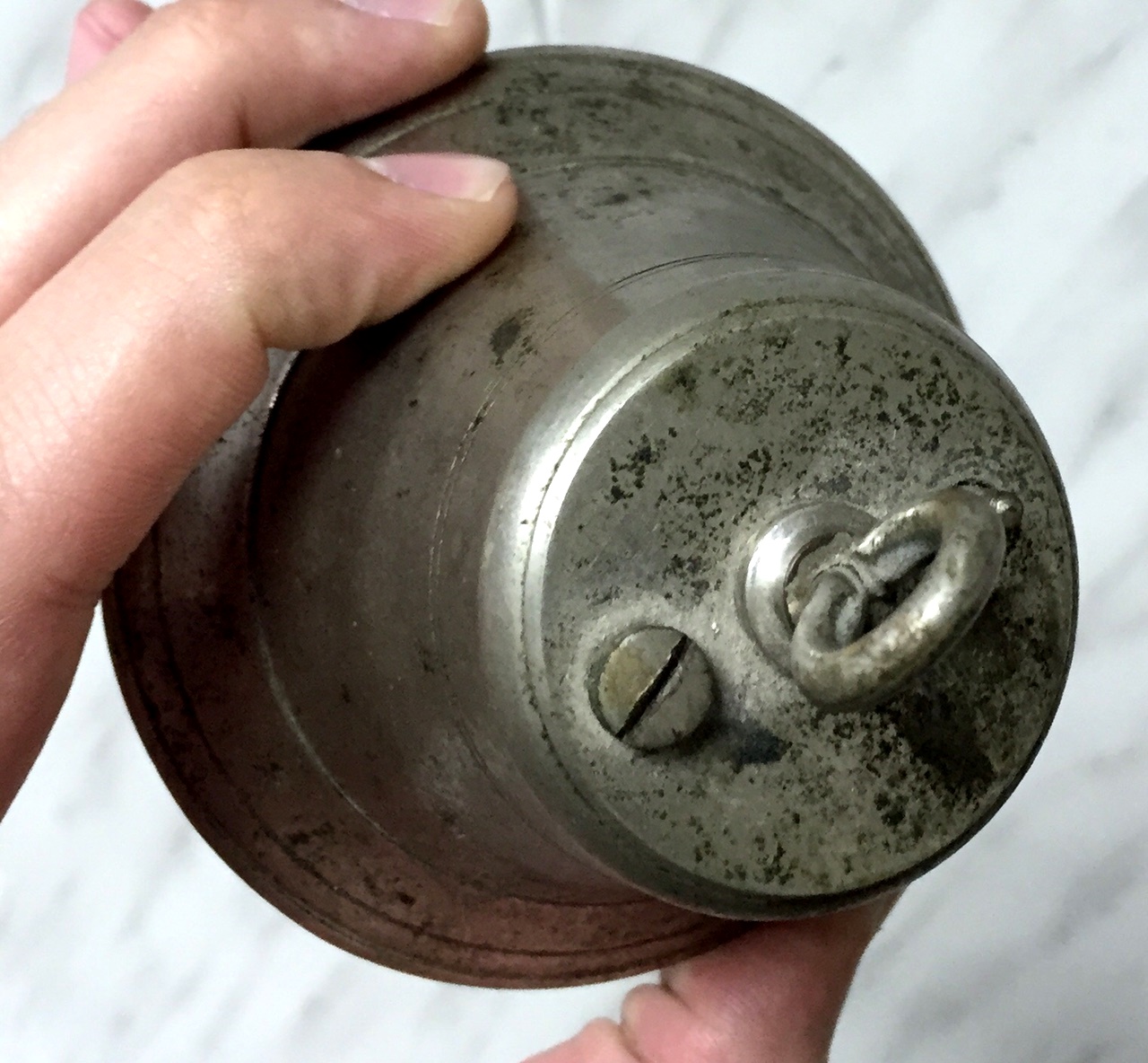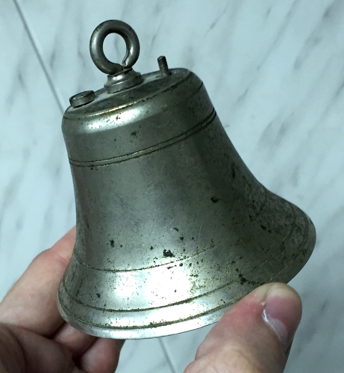 Колокол очень тяжелый. Внутри какой то механизм спрятан. Иногда слышно что то вроде мелодичного звона если его покрутить в руках.