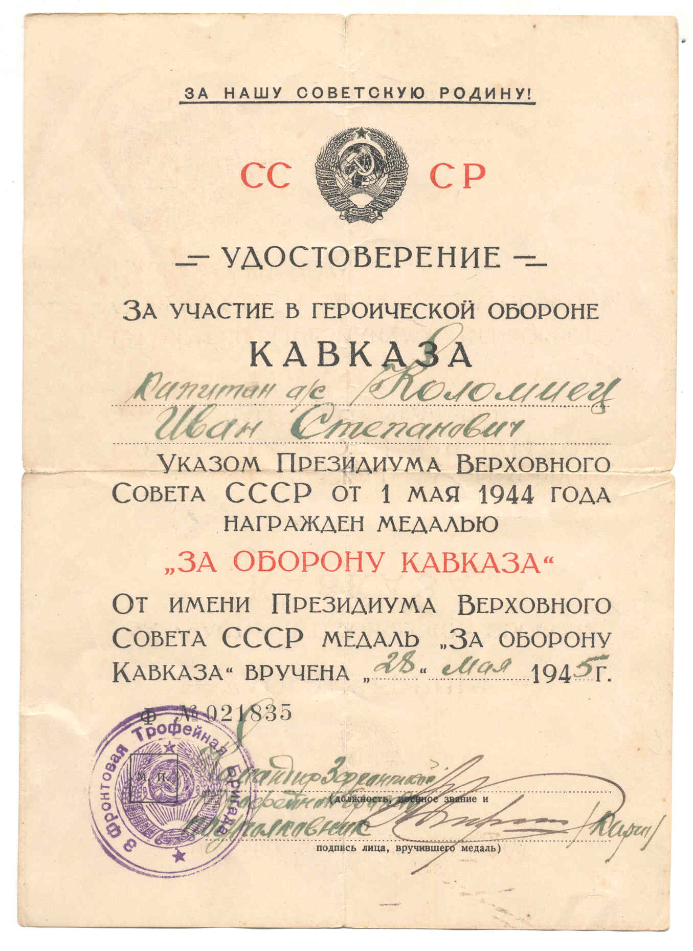 За оборону Кавказа ( 3-я фронтовая трофейная бригада)