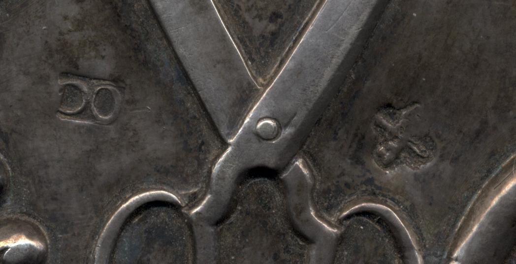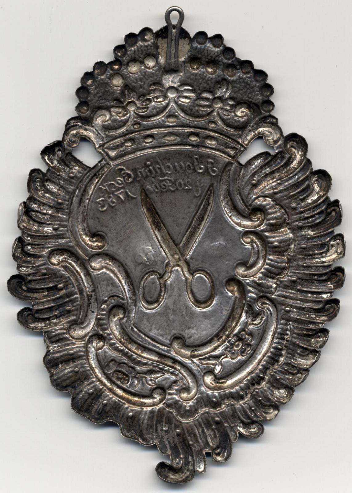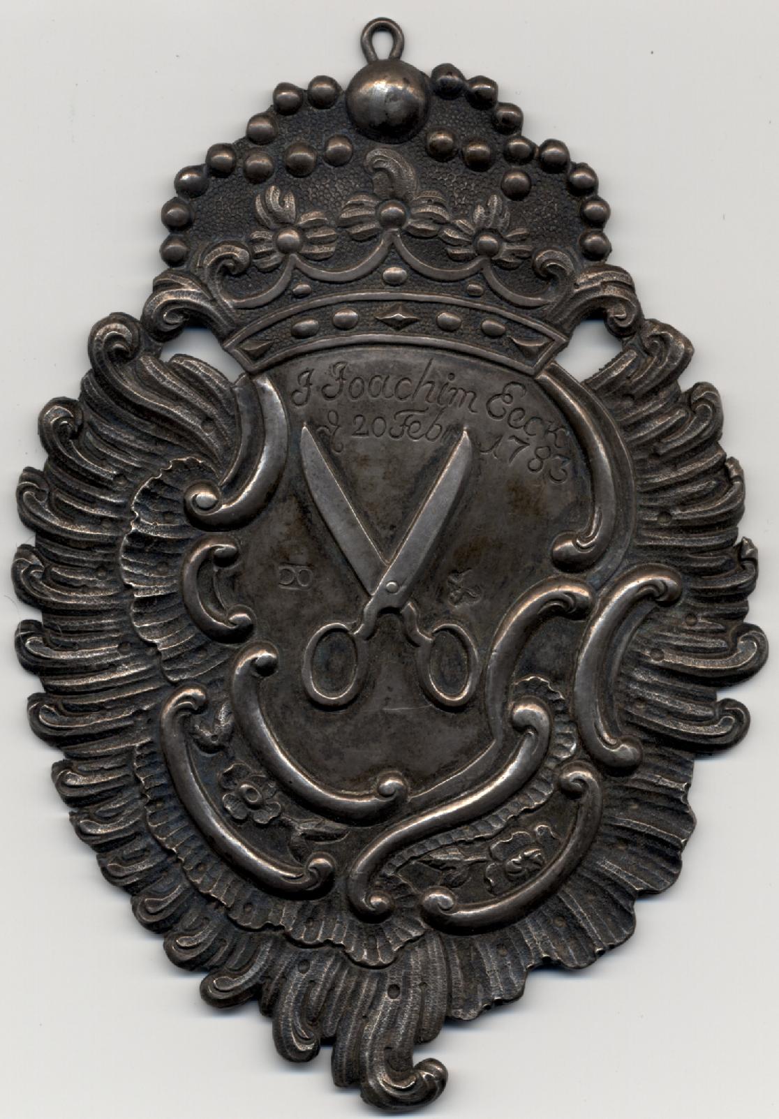 Должностной знак 1783г.в виде барочного картуша с изображением ножниц портного, увенчанный императорской короной, возможно означающий принадлежность к гильдии портных города Дерпт /Тарту/, в то время входившего в состав Российской Империи. Возможно владелец знака Иоахим Экк / Ioahim Eeck/. Дата на знаке "20 февраля"- возможно день присуждения звания. Знак из серебра. Клейма: именник мастера "ОО" и клеймо города Дерпт в виде скрещенных ключа и шпаги. Проба отсутствует.
