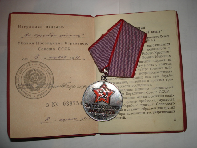 Медали Серп и Молот, За Трудовую Доблесть, За Трудовое Отличие, За Доблестный Труд в Великой Отечественной Войне,За Восстановление Предприятий Чёрной Металлургии Юга, За Восстановление Угольных Шахт Донбасса, За Освоение Целинных Земель, За Строительство БАМ, За Преобразование Нечерноземья РСФСР, За Освоение Недр и Развитие Нефтегазового Комплекса Западной Сибири, Ветеран Труда