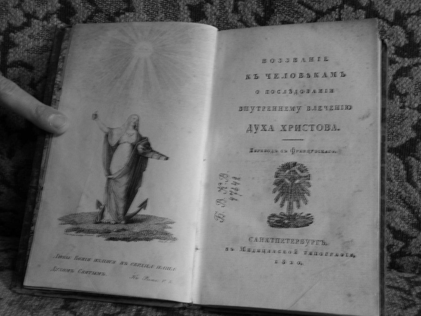 http://fershal.narod.ru/Memories/Texts/ ... abzin.htm("Главы из воспоминаний моей жизни"): "Упомяну еще об одной из важнейших книг, им изданных с целию объяснения внутреннего христианства, это «Воззвание к человекам о последовании внутреннему влечению Духа Христова» (1820). На французском языке называется она «De 1'lnstinct divin»66 и составляет величайшую редкость. Никто никогда в России со времени Новикова не издавал столь важных книг и в таком количестве, как Лабзин. Но со времени закрытия масонских лож в 1822 году не только эти книги, но и переводы сочинений Штиллинга и Эккартсгаузена были строжайше запрещены в продаже."
