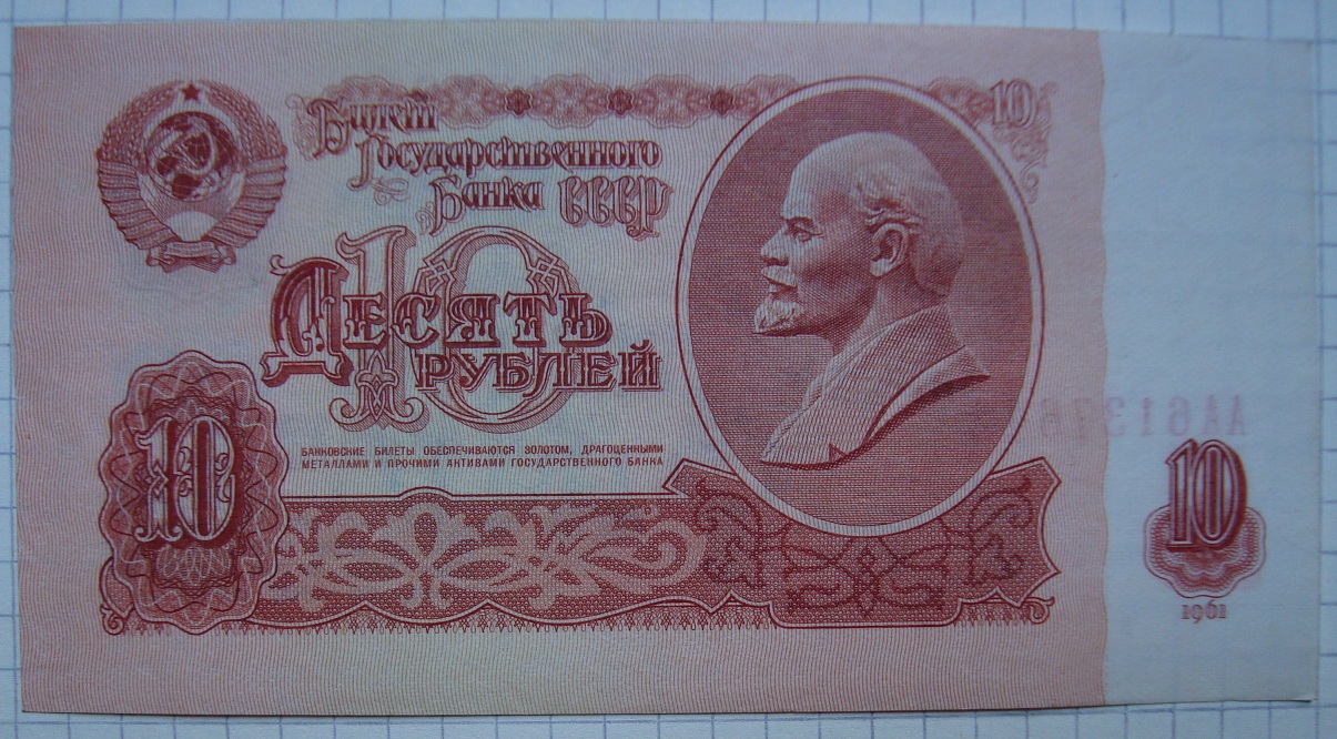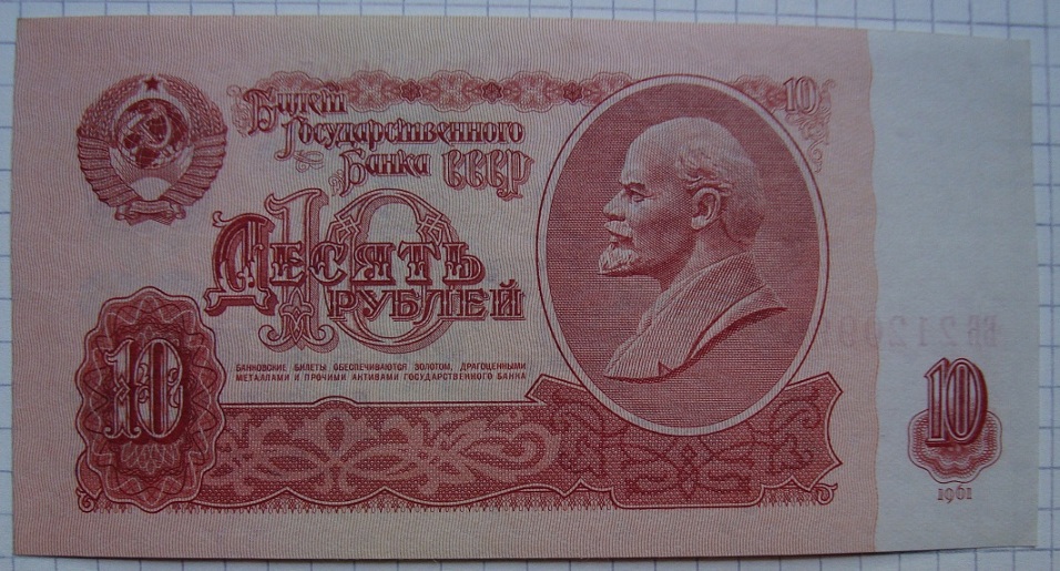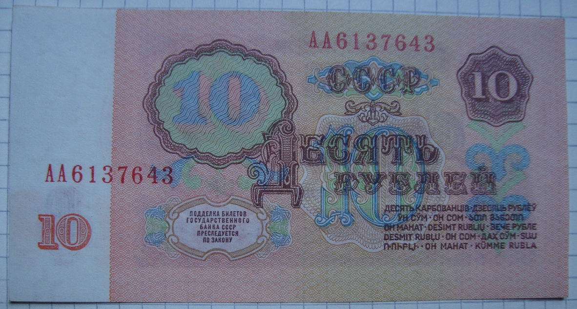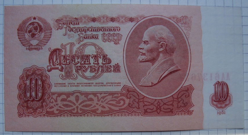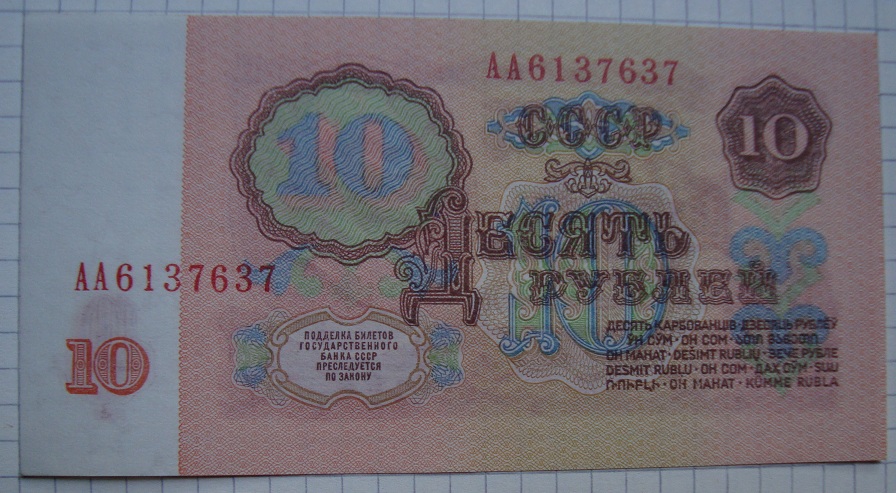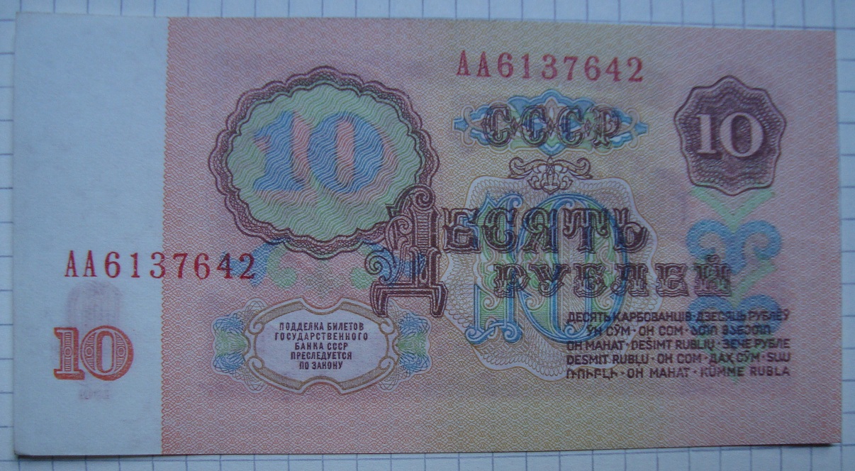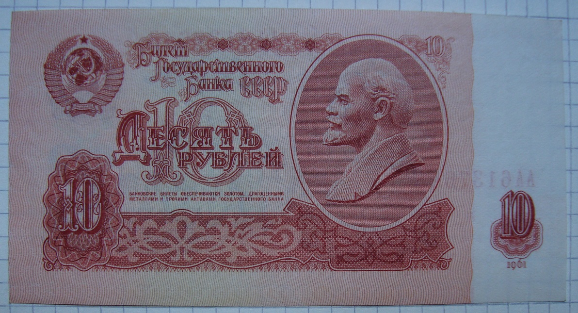 Билеты государственного банка СССР 10 рублей 1961 года.1-й тип шрифт серия «АА». Бумага первого типа, из "стартовых" серий (т.е. те, что были отпечатаны до 01.01.1961г.) и 1-й тип шрифт серия «ББ»
