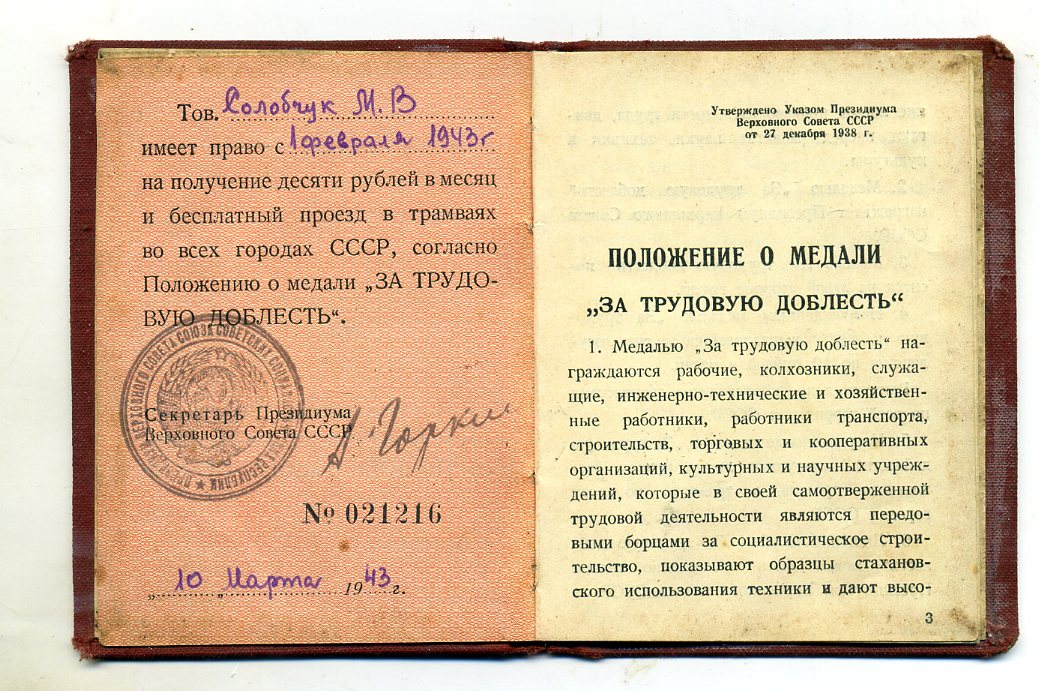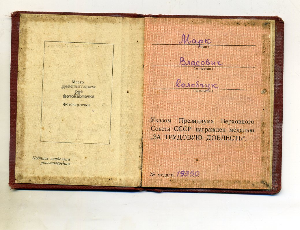 Медали Серп и Молот, За Трудовую Доблесть, За Трудовое Отличие, За Доблестный Труд в Великой Отечественной Войне,За Восстановление Предприятий Чёрной Металлургии Юга, За Восстановление Угольных Шахт Донбасса, За Освоение Целинных Земель, За Строительство БАМ, За Преобразование Нечерноземья РСФСР, За Освоение Недр и Развитие Нефтегазового Комплекса Западной Сибири, Ветеран Труда