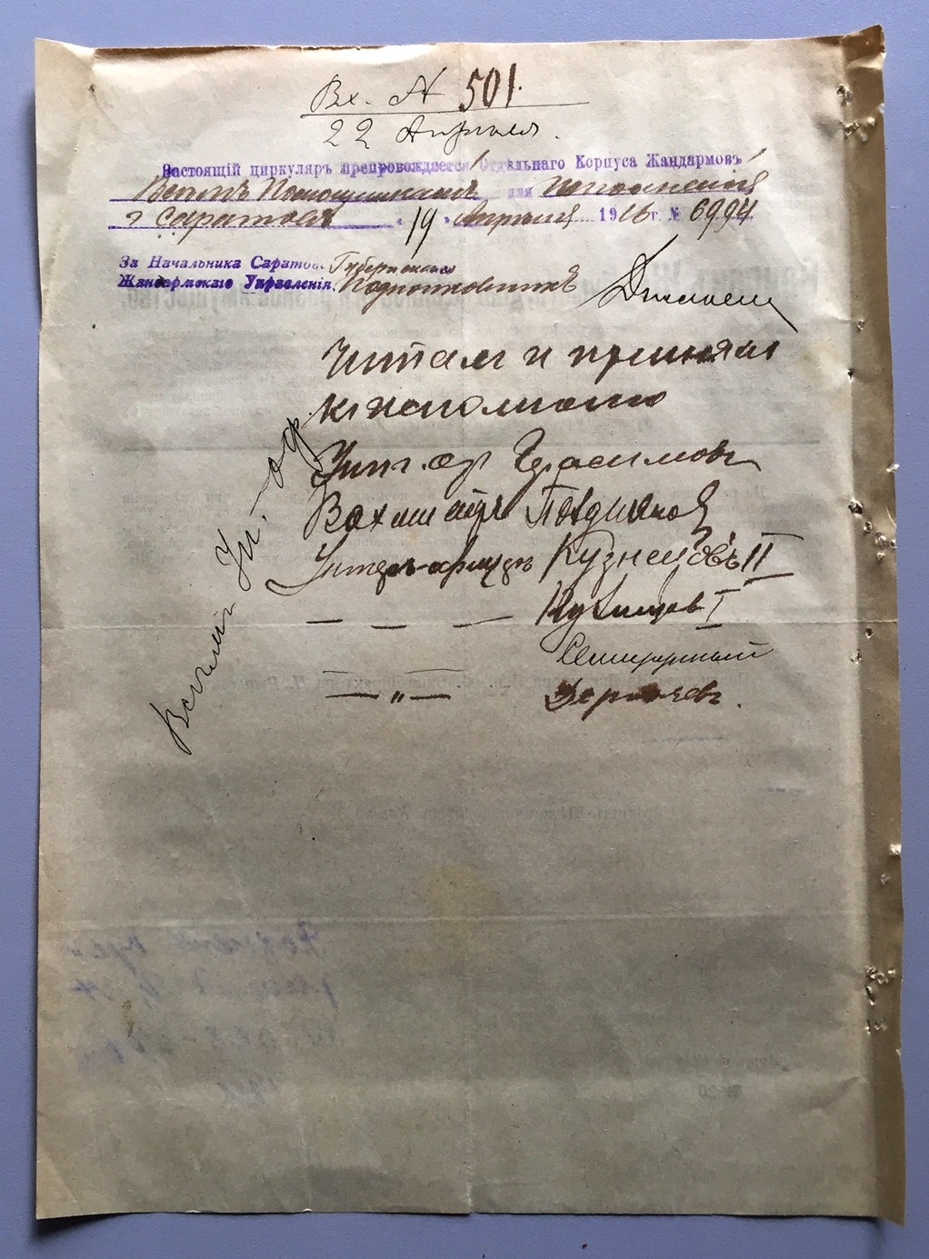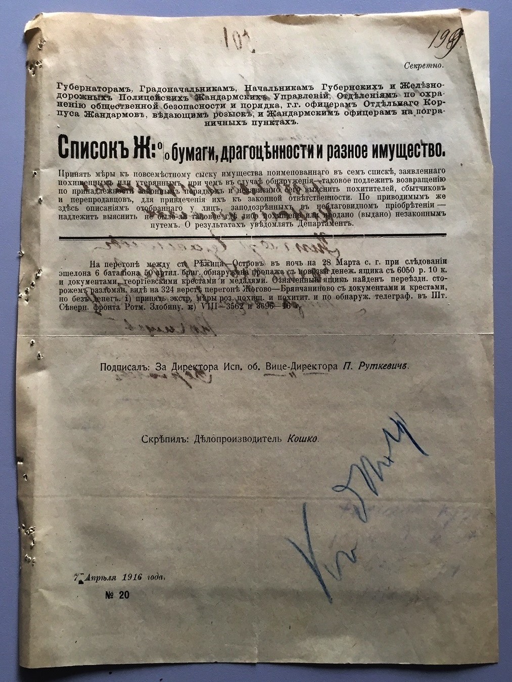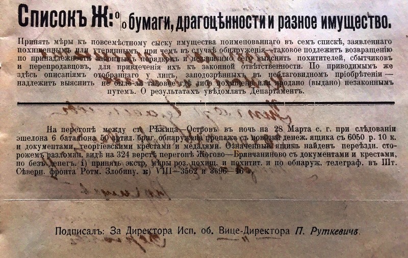 Продается документ уголовного розыска 1916г. о краже из эшелона 6-го батальона, 50-ой артиллерийской бригады, ящика с Георгиевскими крестами и медалями.