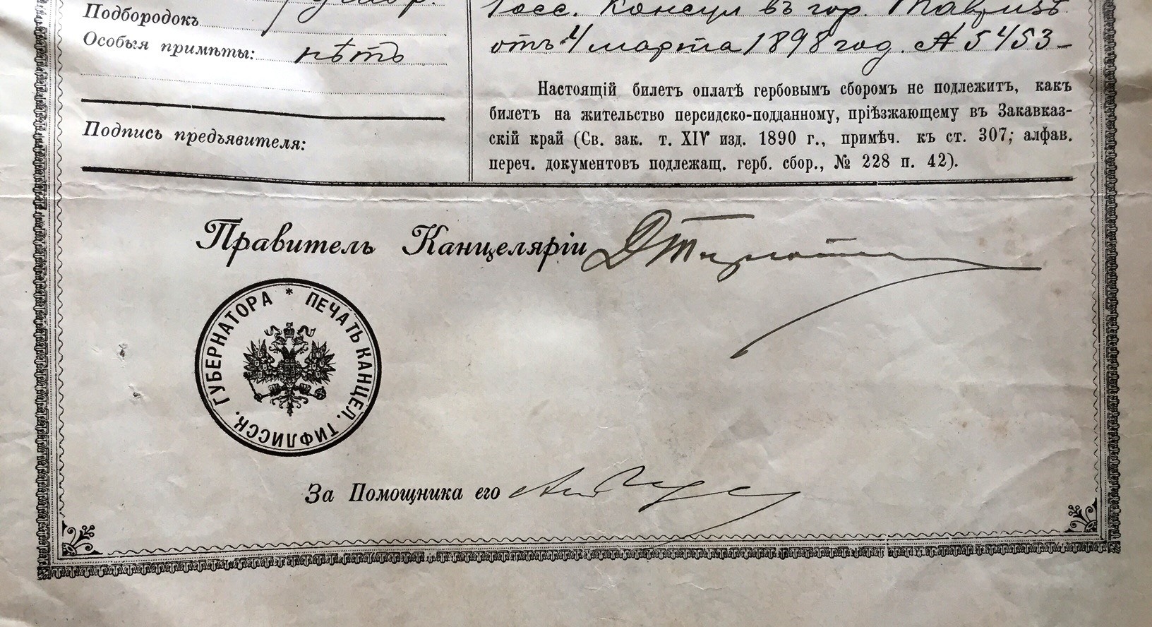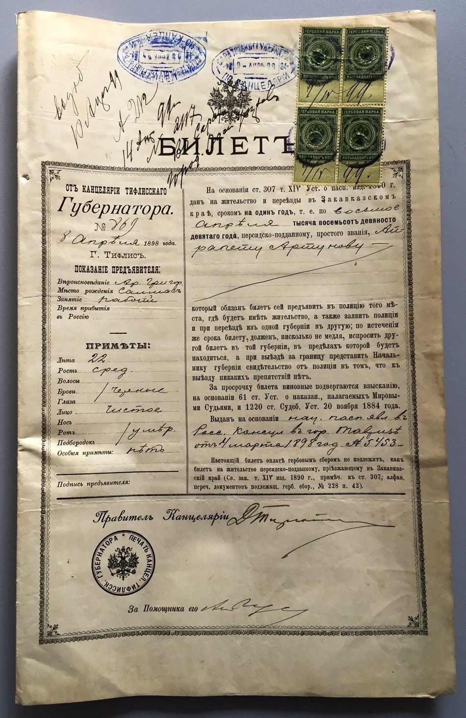 Билет на жительство на иностранца. Город Тифлис.