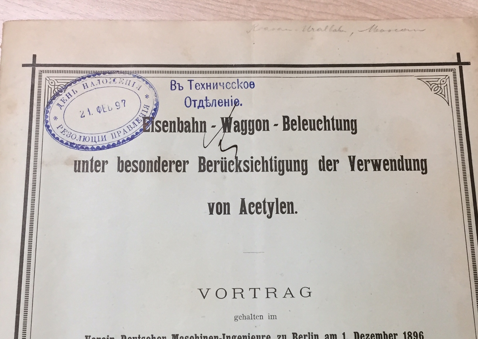 Публикация доклада главного инженера берлинской фирмы Юлиуса Питча на собрании/коференции/ инженеров в Берлине в декабре 1896 года.