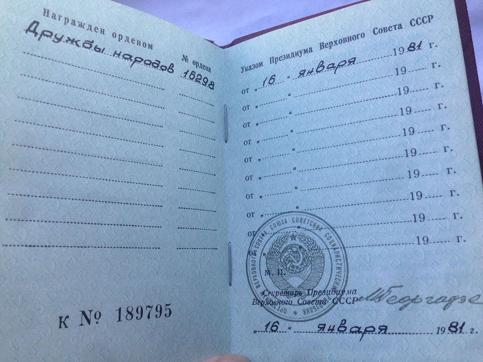 ДРУЖБА НАРОДОВ № 16 298 с документом.