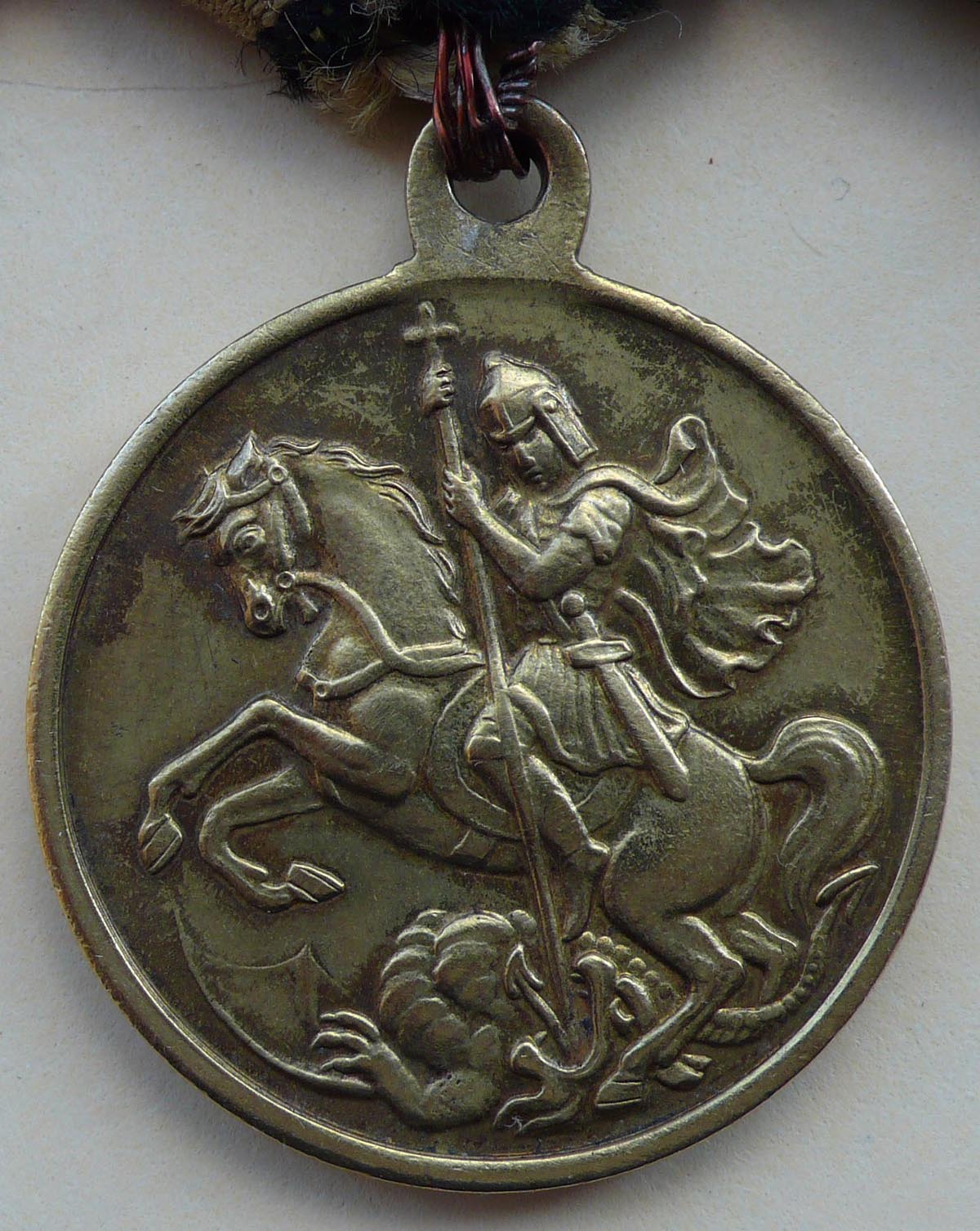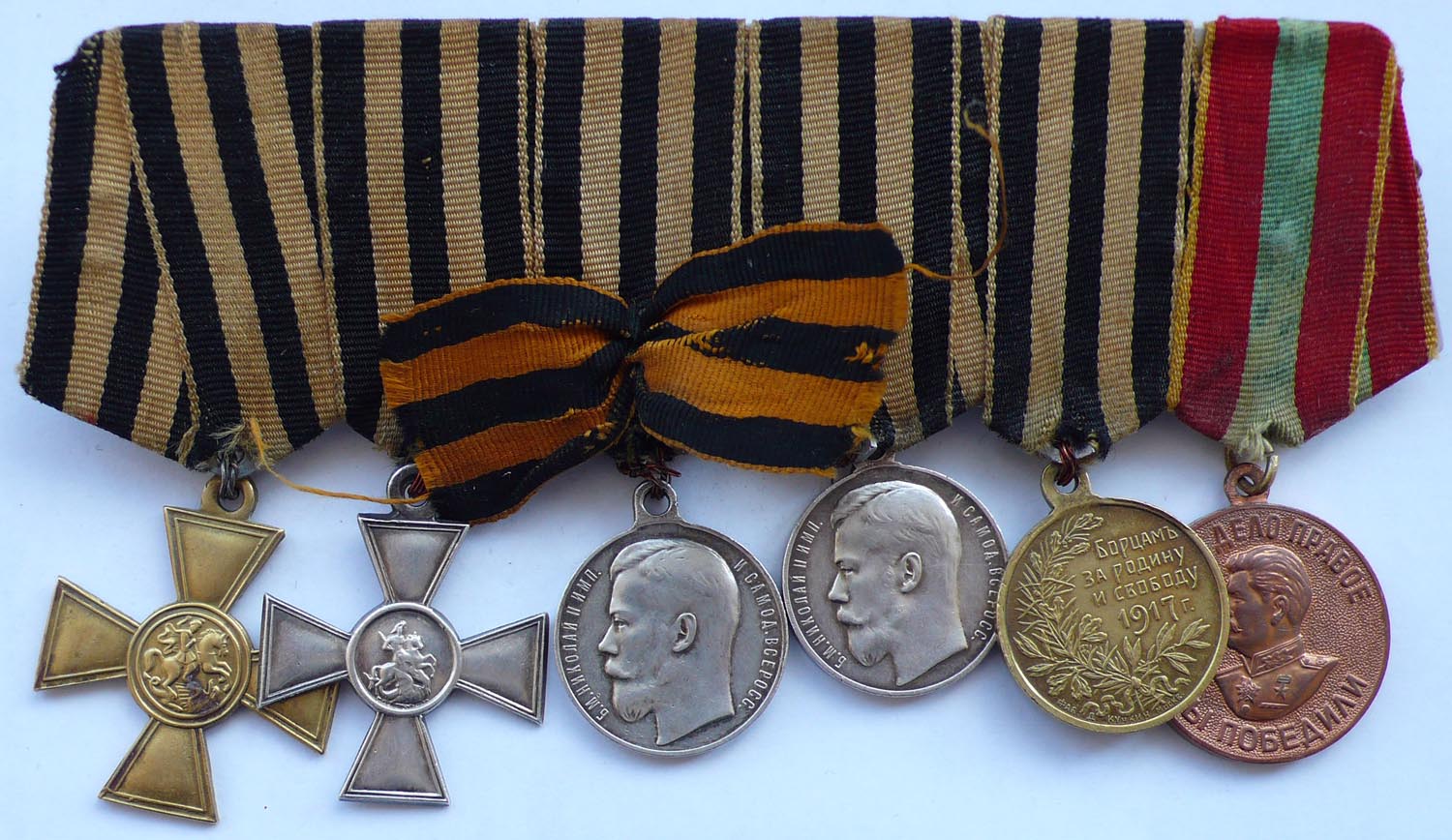 На фото хорошо видны крест, две медали и жетон-медаль "Борцам за Родину и свободу 1917г."