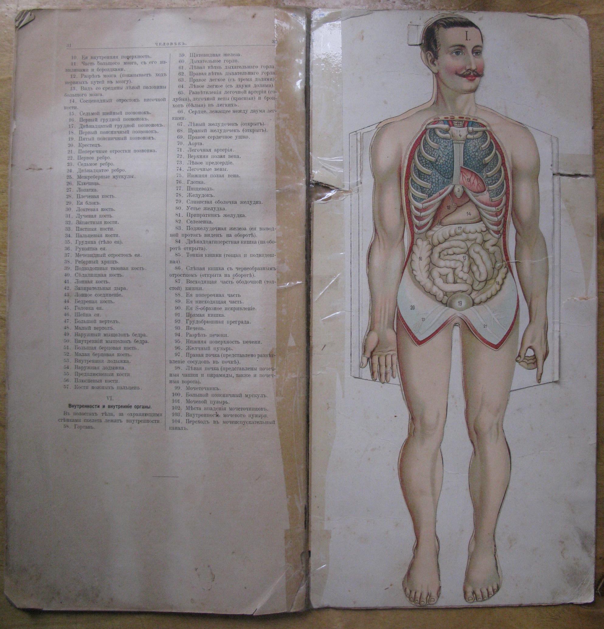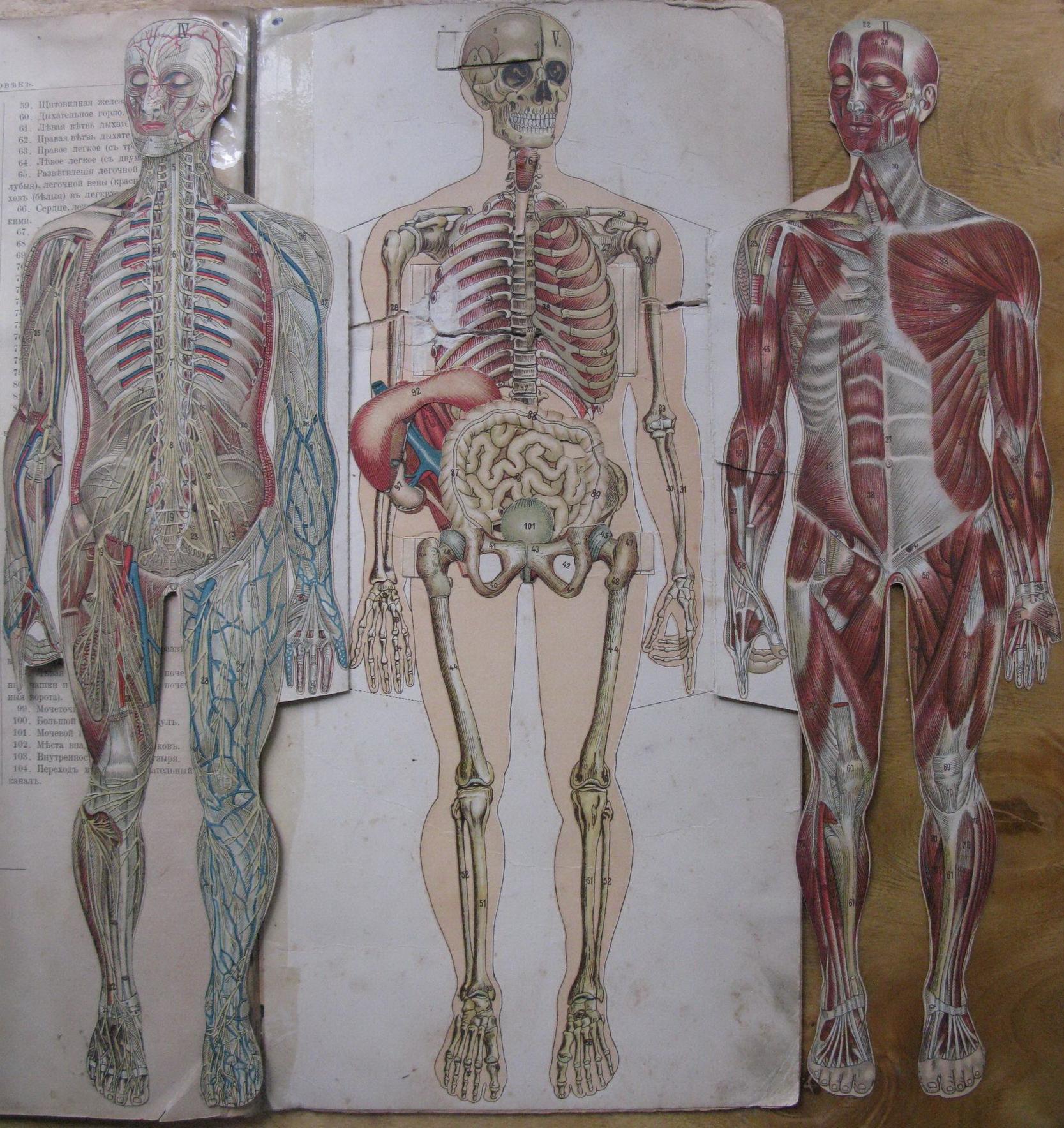 Книга "Человек, изображение его строения на 5 таблицах" с вложенными наглядными иллюстрациями строения человека. С объяснительным текстом доктора Фета. Перевод с немецкого доктора Гольдингера. Четвертое издание. Москва, издание И. Кнебель, 1907. Отпечатано товариществом "Печатня С.П. Яковлева" на Петровке.