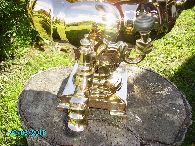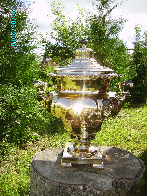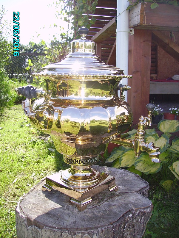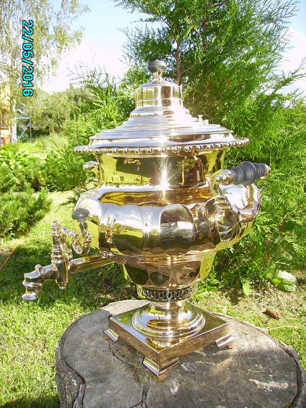 Для любителей больших томпаковых тяжелых ваз.Самовар обьемом думаю литров 7-8.Точно завтра померю,неуспел.Высота 52 см по кончик прихватки.Тяжелый и толстостенный самовар.Кто побаивается полированные предметы сразу успокою-никаких паек и трещинСамовар даже образивом не трогался,сразу на круг полировальный пошел.Причина-невзрачный и грязный пятнами был вид.Так думаю выглядит чуточку получше.Комплектация то что на фото,конфорки нет(размер 74 мм) Заглушка немного по цвету отстает,но и от латуни тоже отличается.Нет крышки зольника.Лужение свое родное.прихватки колхозить латунные не стал,уверен кто купит все равно все что не в цвет выкинет,дерево от прихваток могу положить.МПЦ 40 т.р.Дальше по мере заинтересованности.