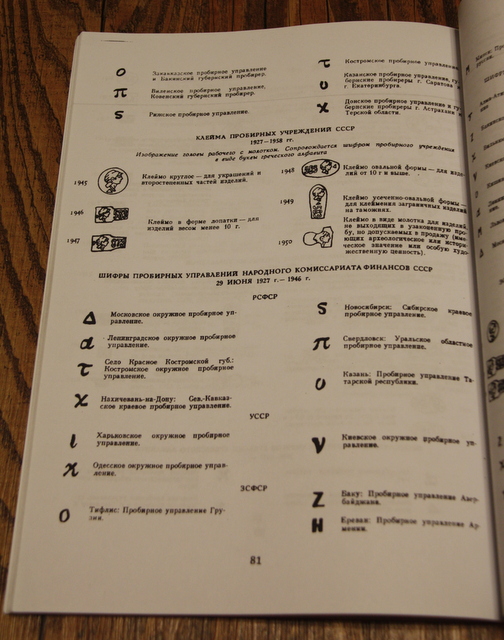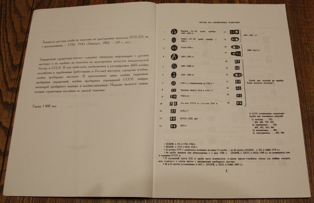 Указатель русских клейм на изделия из драгоценных металлов XVII-XX вв Марина Михайловна Постникова-Лосева 100 стр. ч/б, 3000 клейм формат А-4 Репринтный справочник "Указатель русских клейм на изделиях из драгоценных металлов ХVII-ХХ вв." приводит изображения и расшифровку более 2600 клейм российских и зарубежных (работавших в России) мастеров, городские клейма, клейма пробирных мастеров. Настоящий справочник призван удовлетворить интересы коллекционеров, экспертов и людей, интересующихся различными вопросами, касающимися развития ювелирного производства в России XX века. Он поможет в определении не только времени и места производства того или иного изделия, но и в определении авторства благодаря расшифровке так называемых именников.