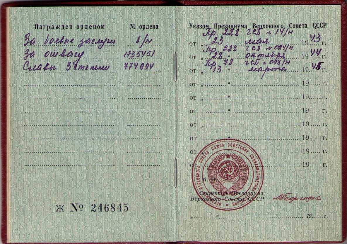 Красного Знамени, Суворова, Кутузова, Богдана Хмельницкого, Александра Невского, Ушакова, Нахимова, Отечественной Войны, Красной Звезды, Славы, За Службу Родине в ВС СССР
