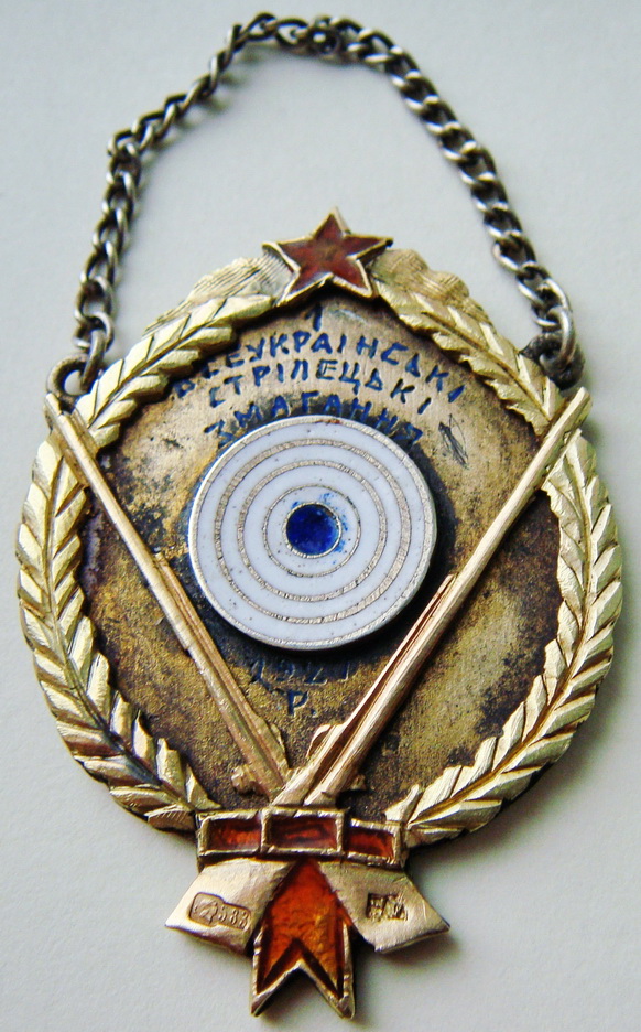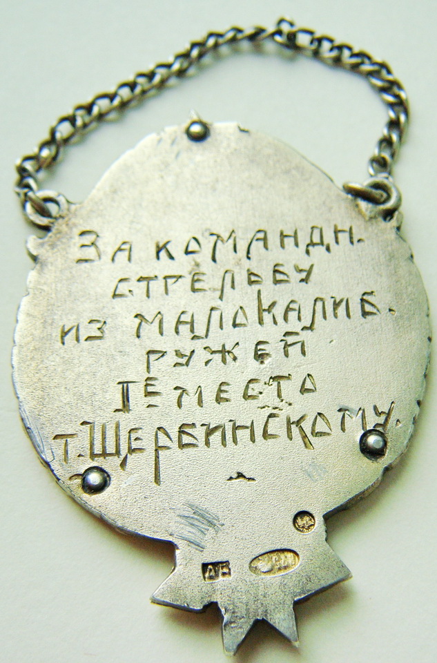 Жетон, выполнен из серебра, с накладкой на аверсе из золота, цифры под мишенью, видимо результаты выстрелов в соревновании. Жетон не описан в литературе и редок в таком исполнении, до военный.