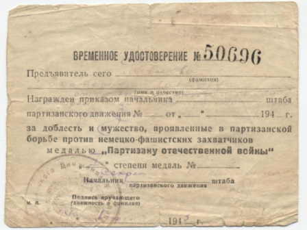 Временное удостоверение + справка из архива на партизана-подрывника Павлову Е.П.