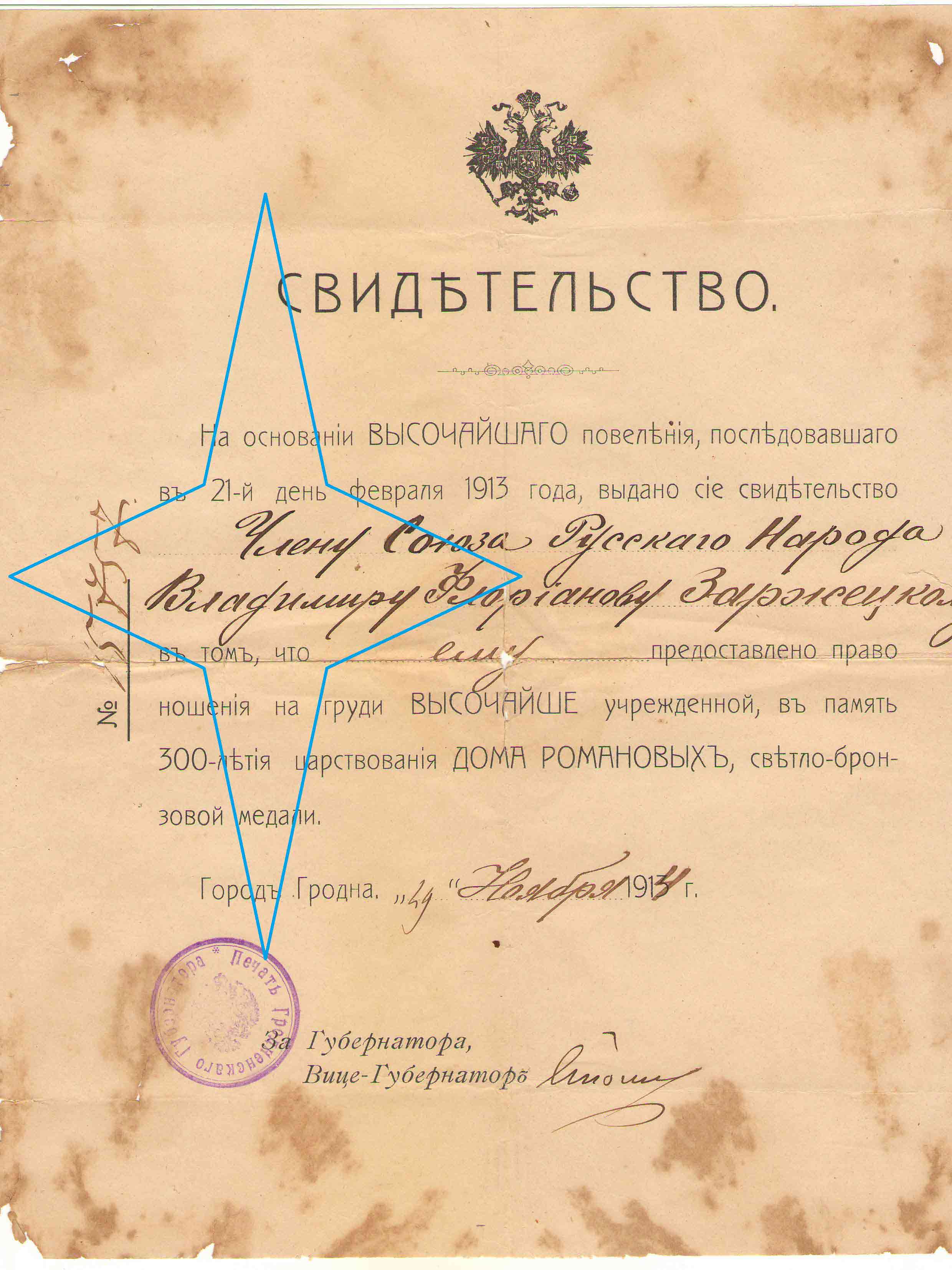 Документ выдан черносотенцу о награждении медалью 300 лет ДР.