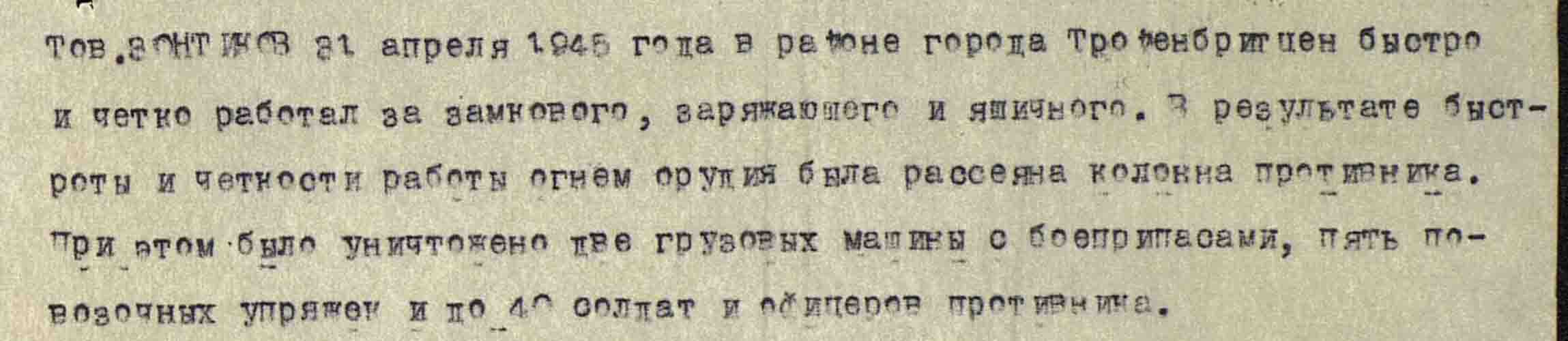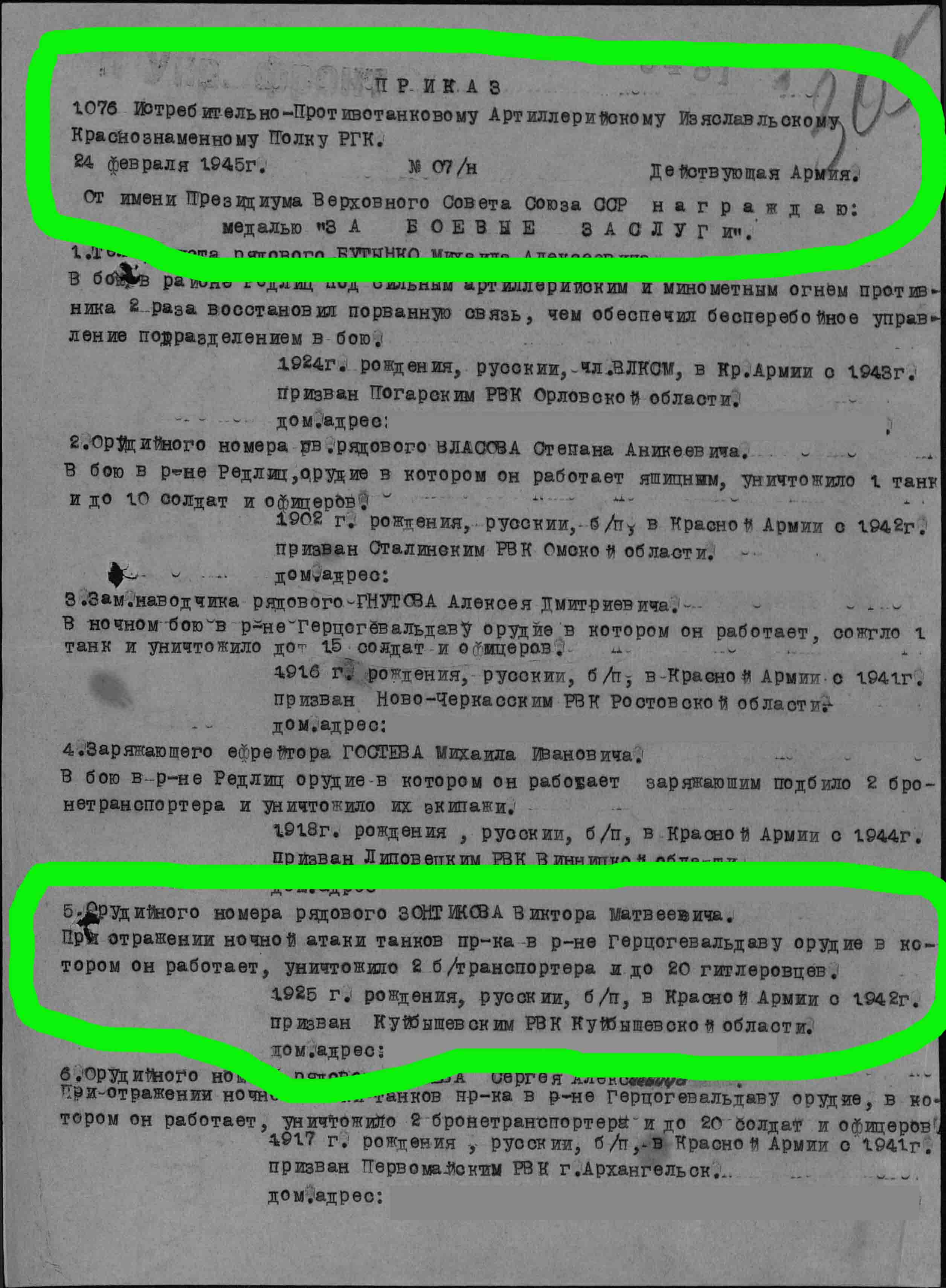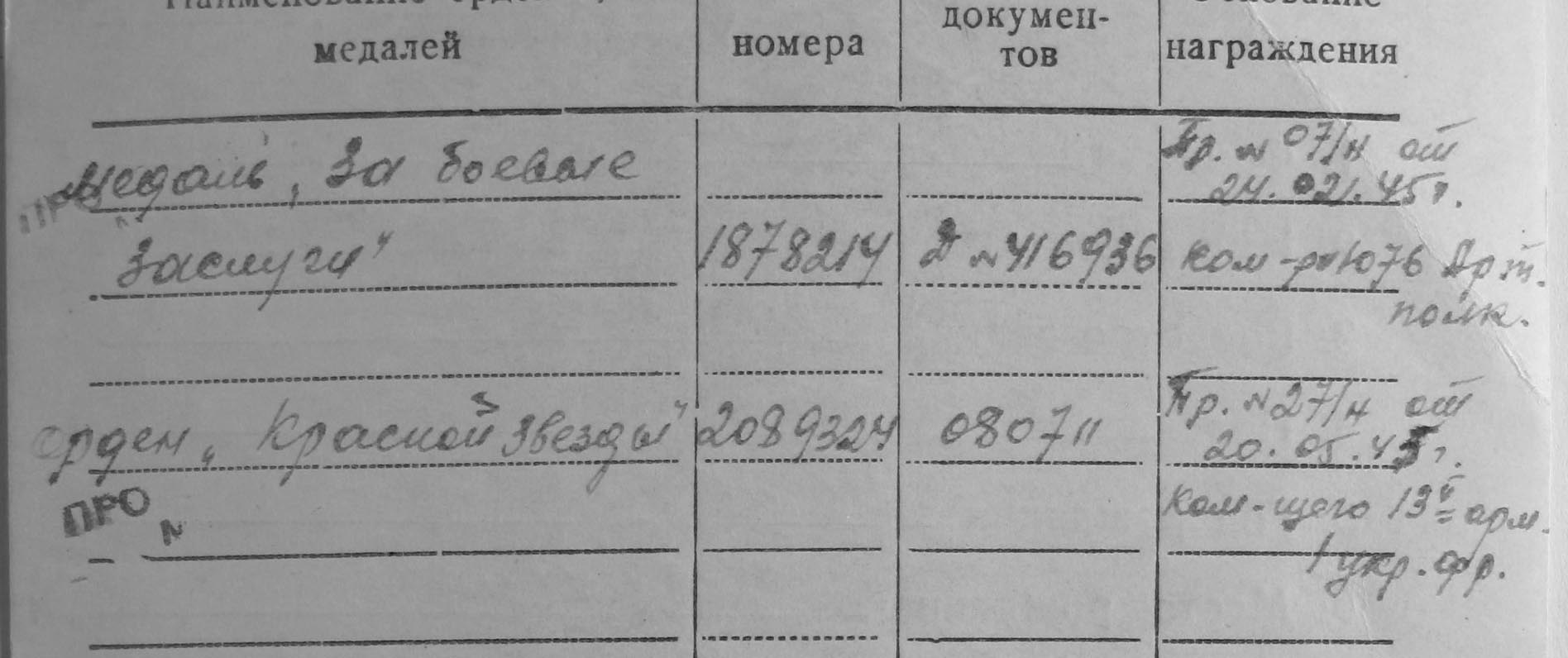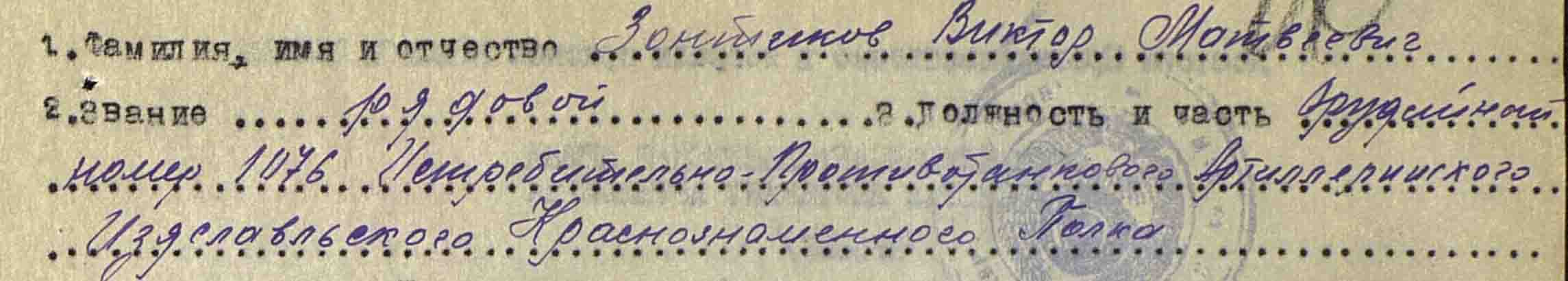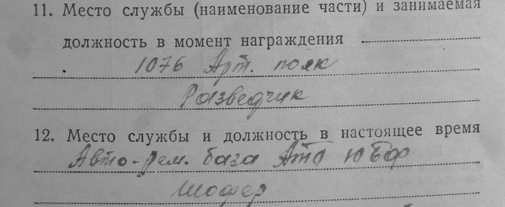 на момент награждения разведчик- артиллерист. потом как имеющий профессию шофера. служил шофером