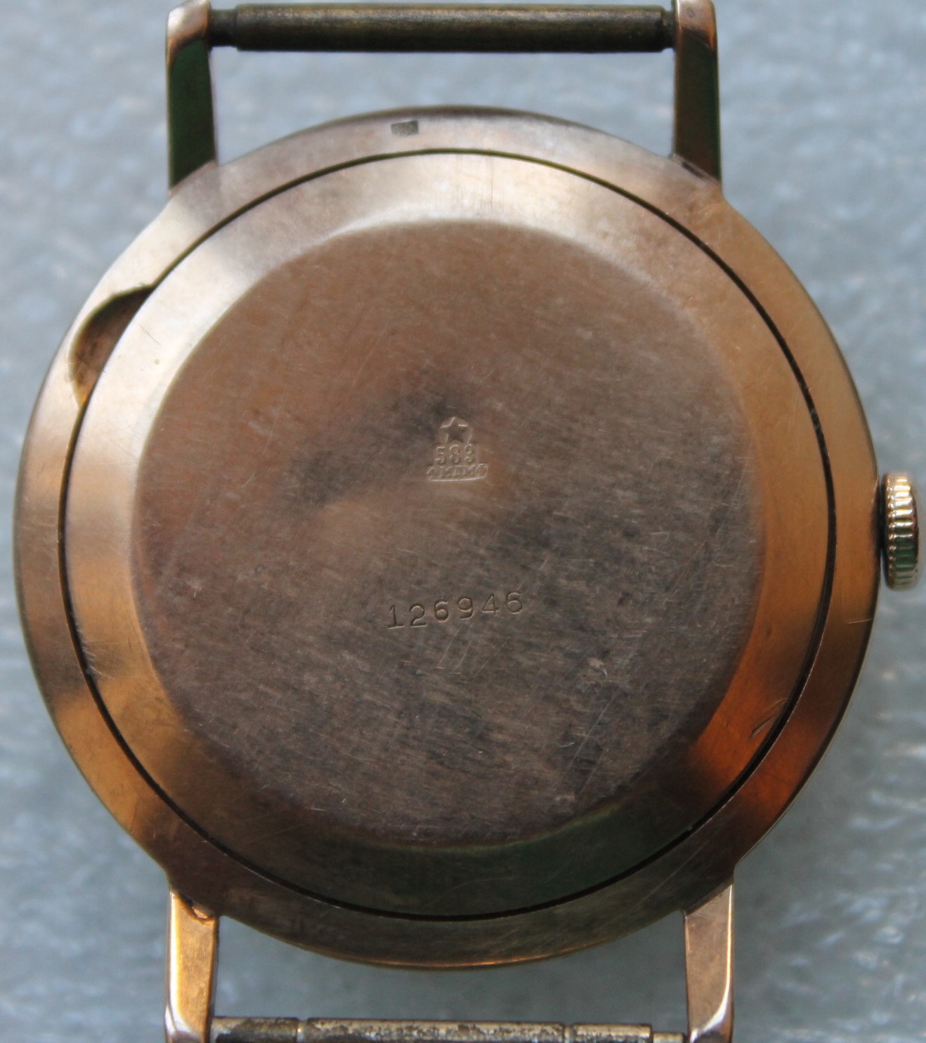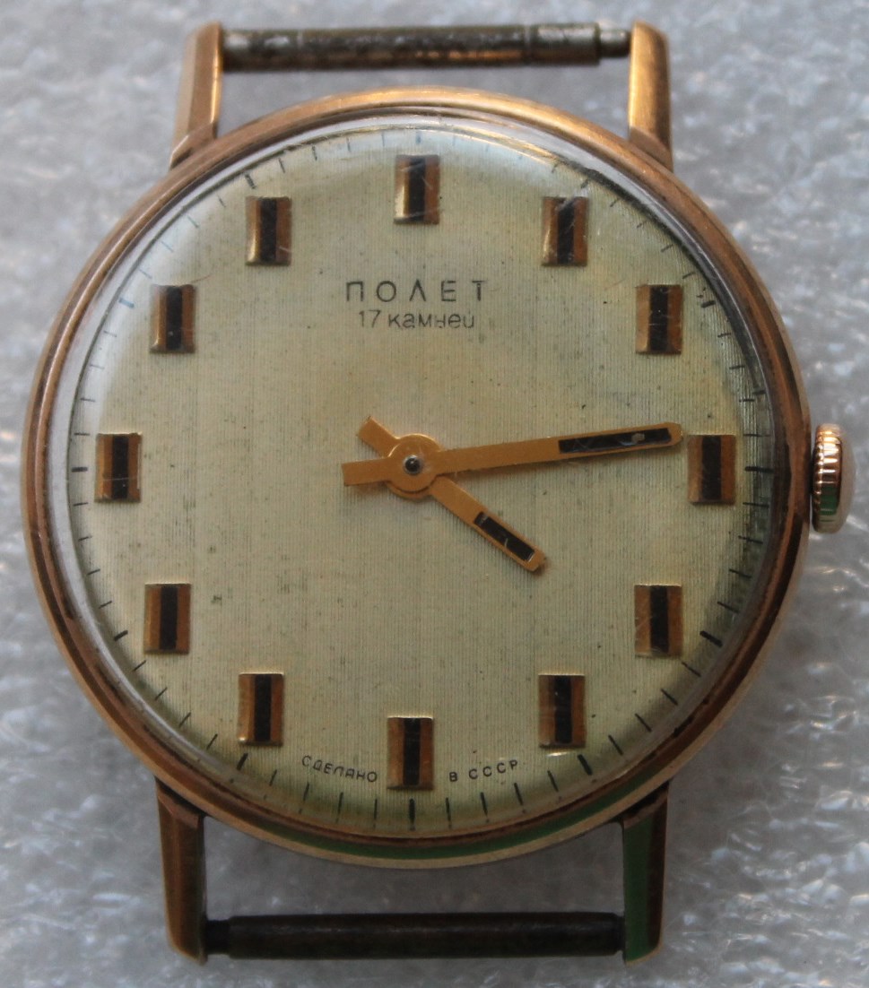 Часы наручные Полет в золотом корпусе 583 пробы, общий вес 28,6 грамма. Часы на ходу. На задней крышке серийный номер 126946, проба 583 и клеймо завода изготовителя золотого корпуса 4 МДМФ - Московский монетный двор Министерства финансов СССР 1974г.