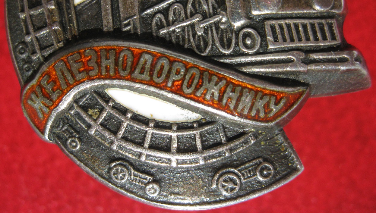 Эмали в отличном состоянии, сколов, чешуек и подмазок нет. Есть едва заметная светлая точка диаметром меньше 1 мм на знамени выше первой буквы О в слове "ПОЧЕТНОМУ". Есть легкая карапка на ленте на второй букве Н в слове "железнодорожнику". Других дефектов в 8-ми кратную лупу не разглядел,ка ни старался