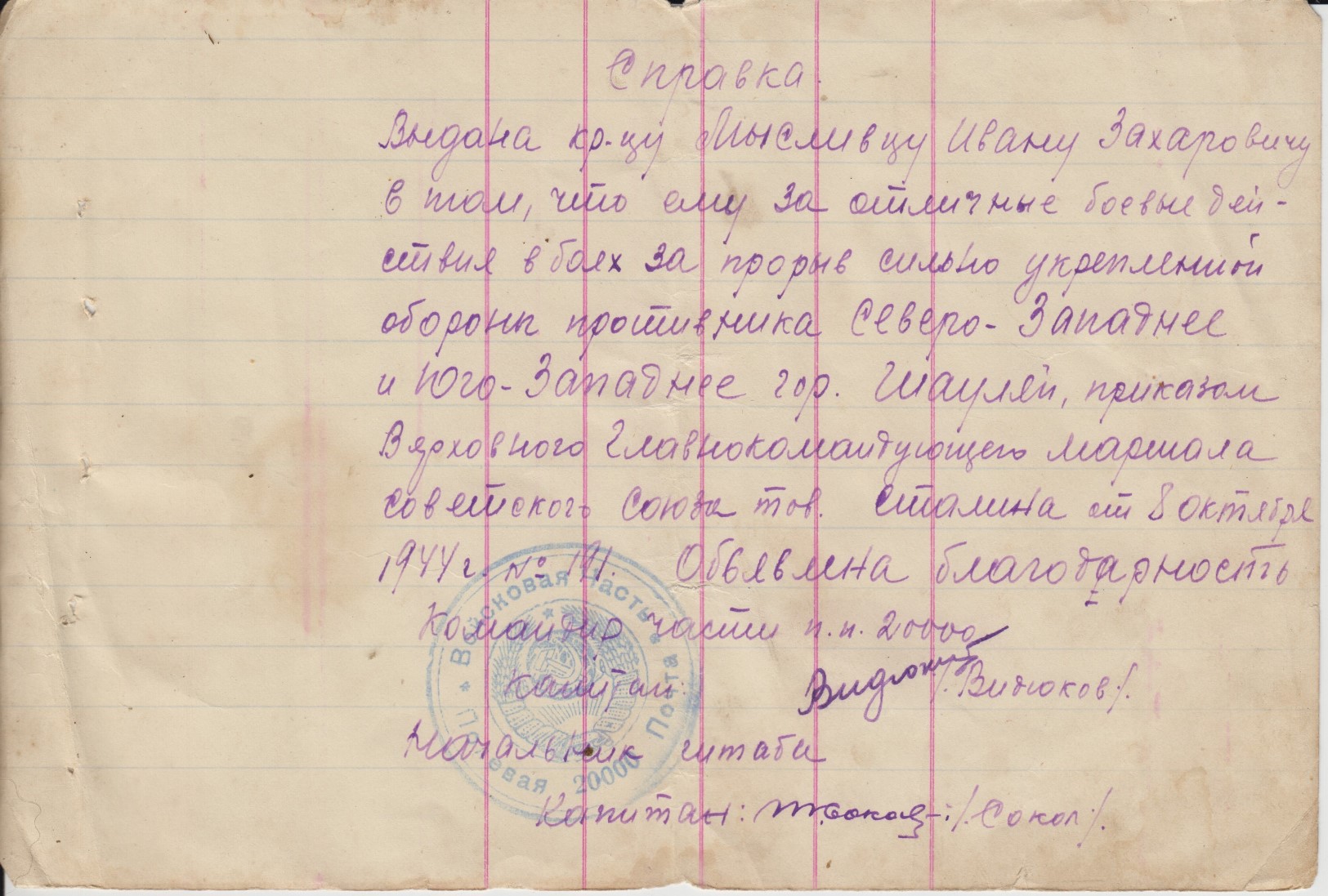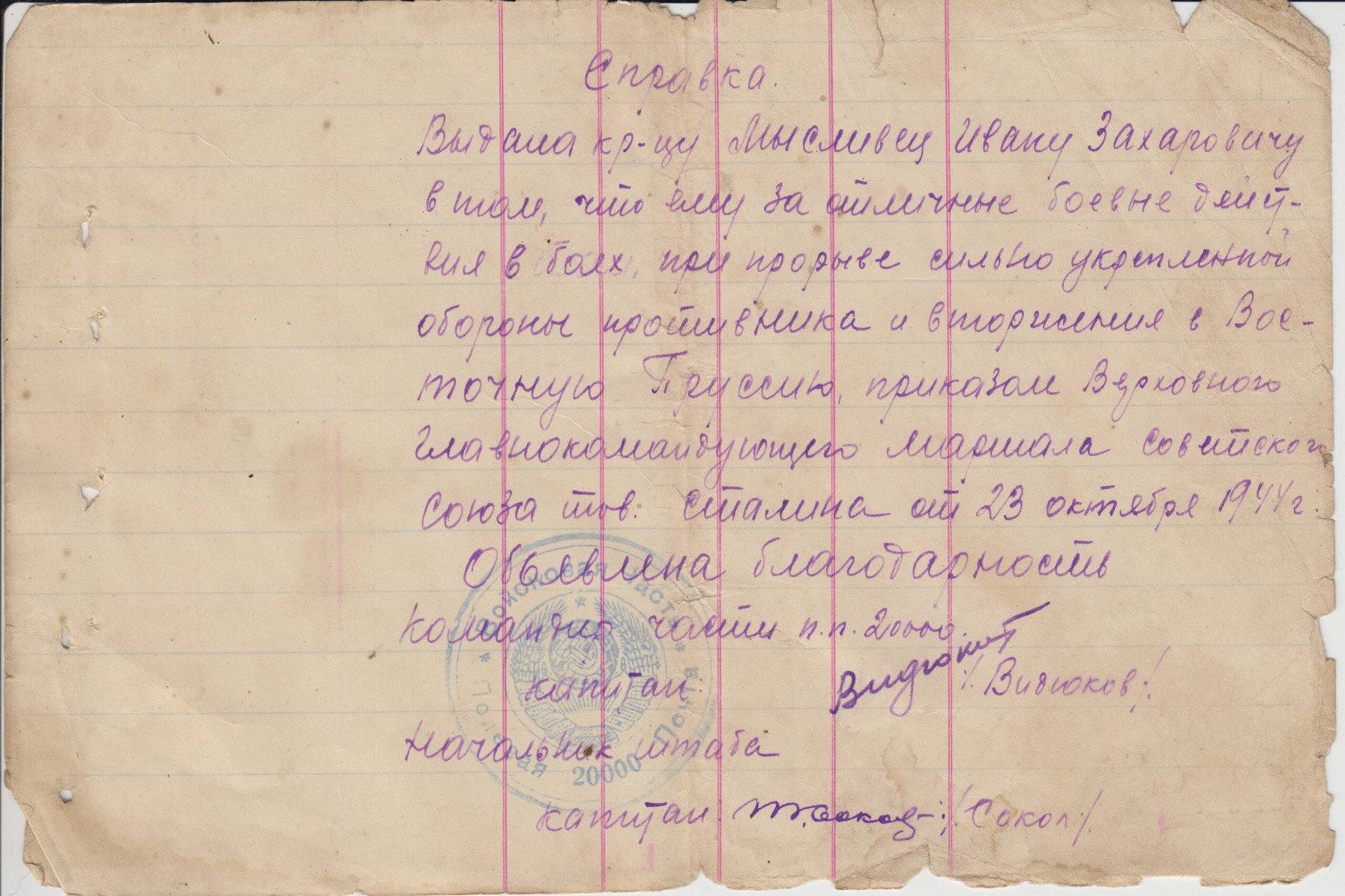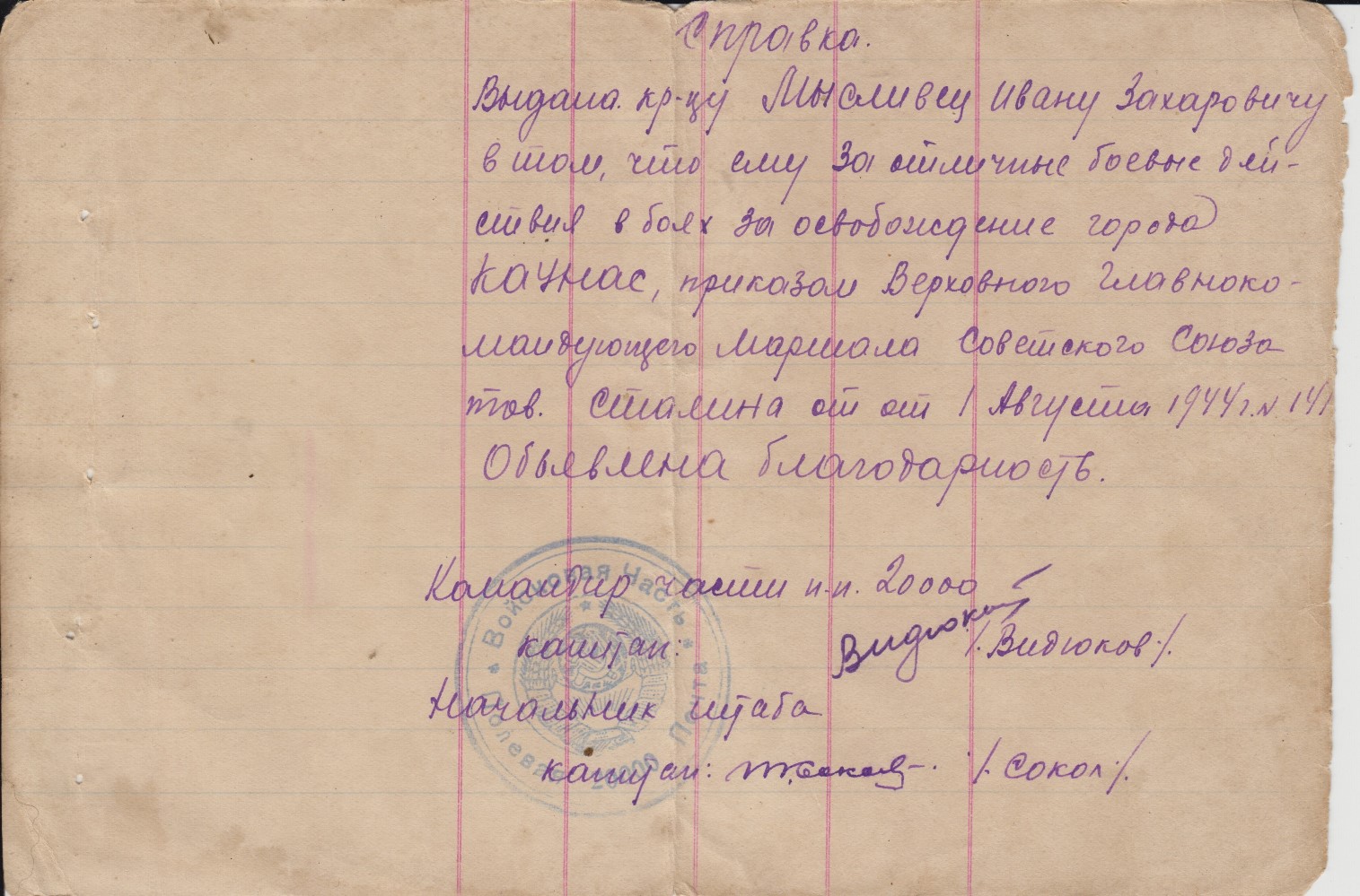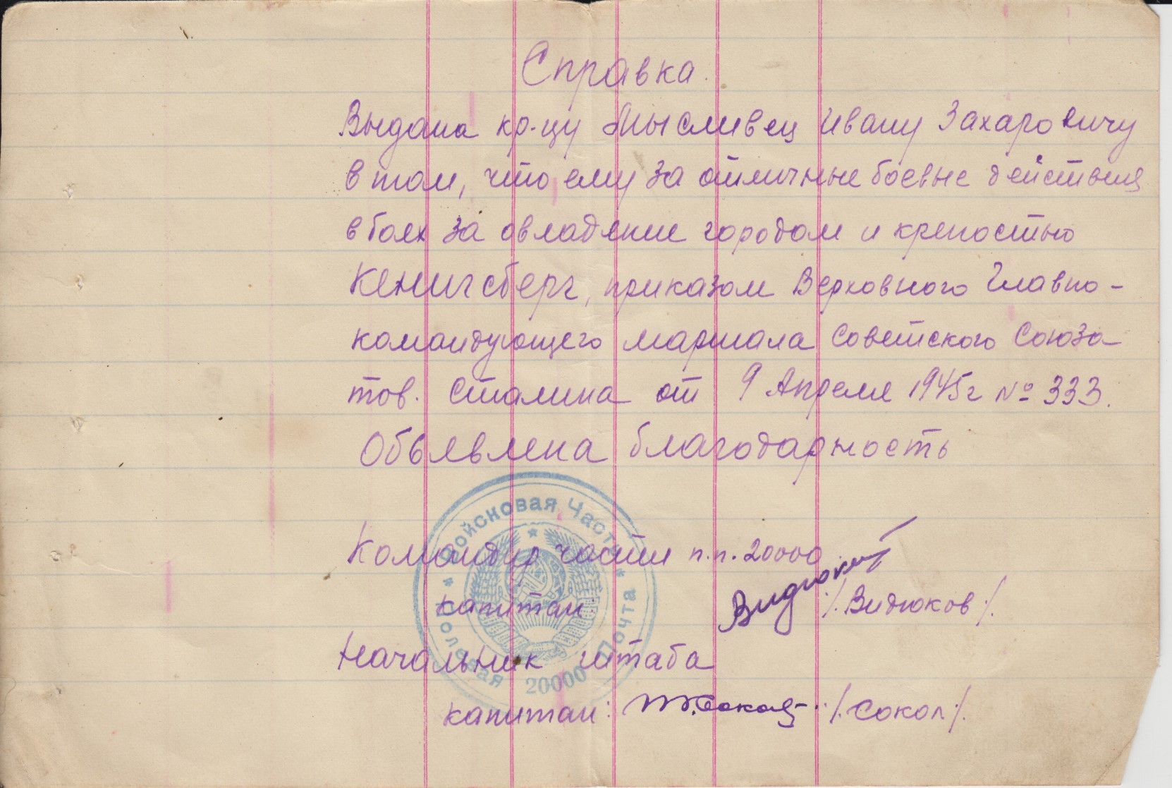Состояние на скане. На благодарностях стоит печать п/п 20000 т.е. благодарности написаны когда батальон дислоцировался на територии Монголии и вел боевые действия с японскими империалистами.Отправка всюду 5$.