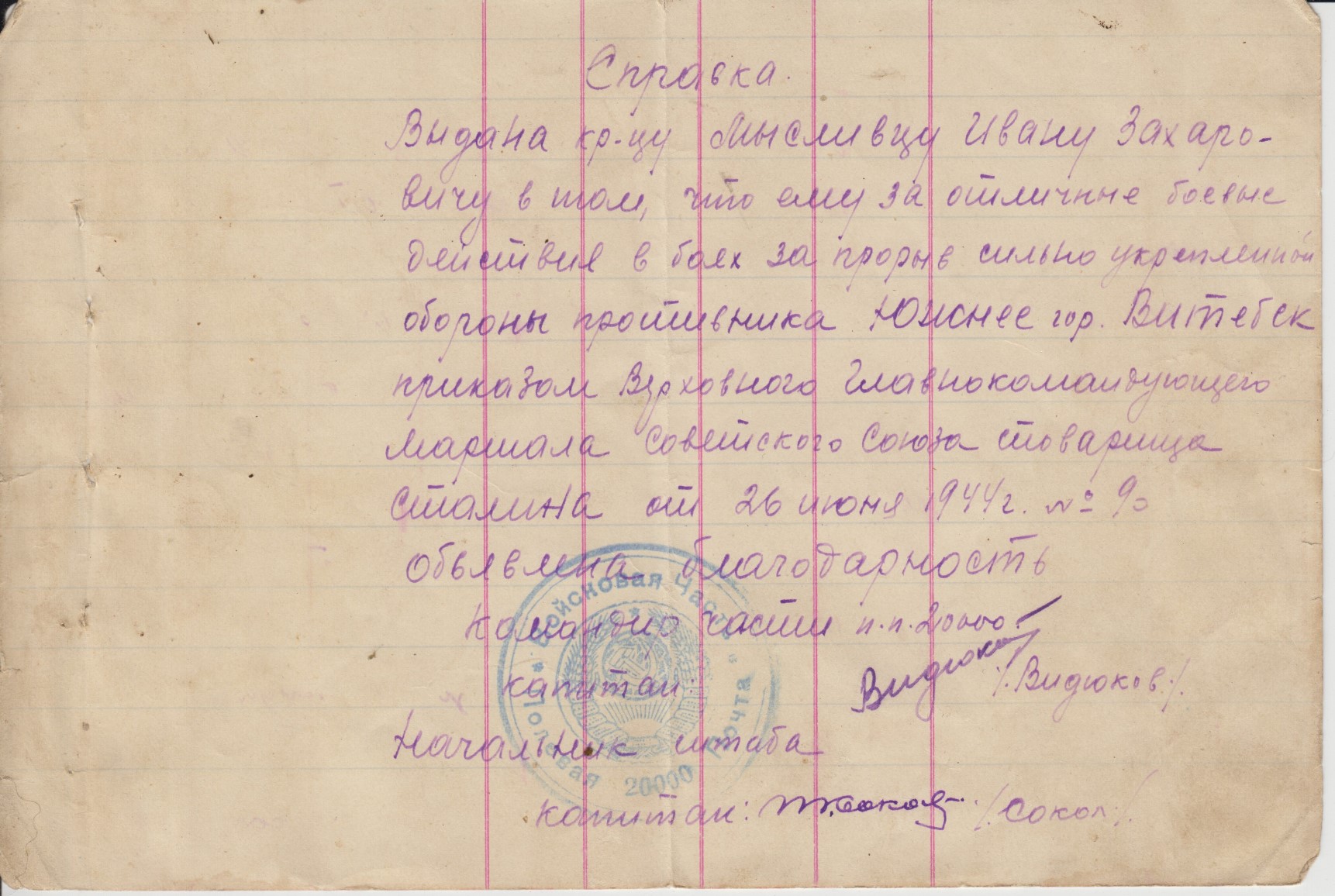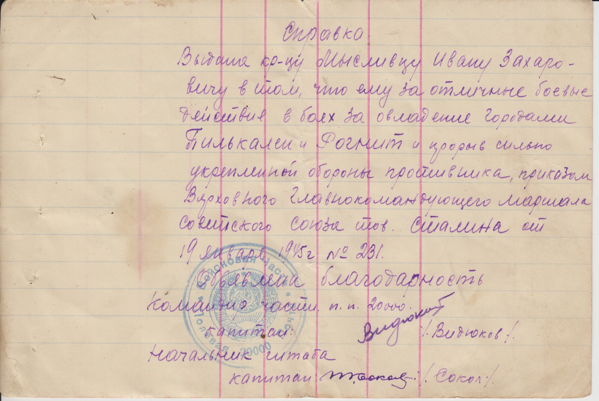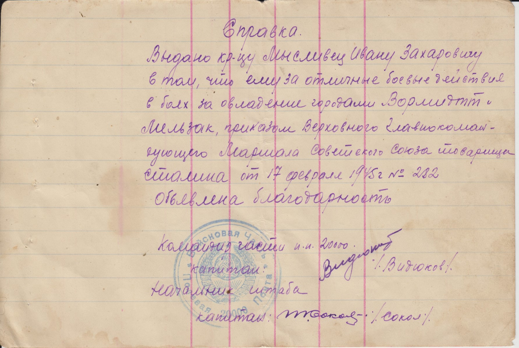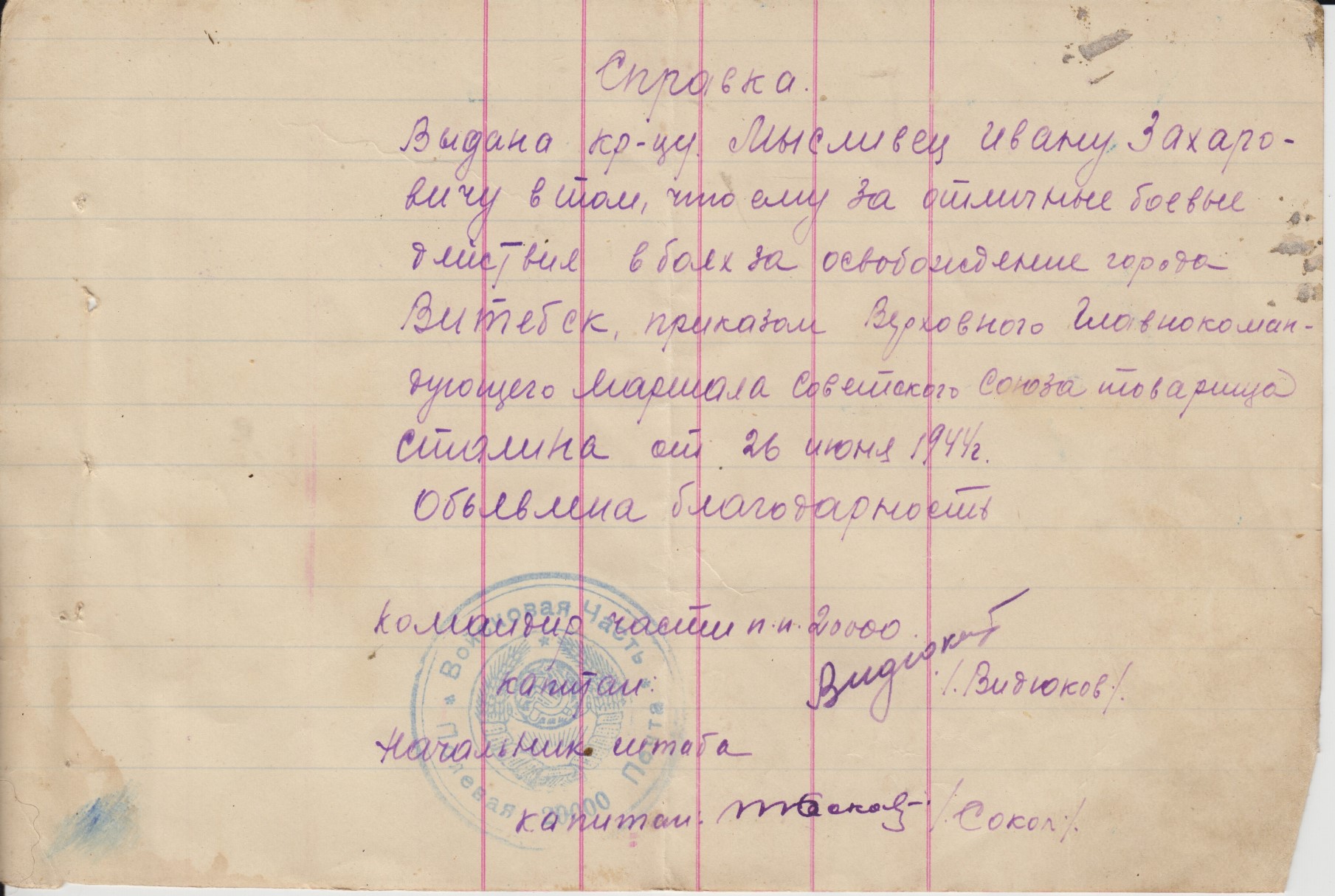 Состояние на скане. На благодарностях стоит печать п/п 20000 т.е. благодарности написаны когда батальон дислоцировался на територии Монголии и вел боевые действия с японскими империалистами.Отправка всюду 5$.