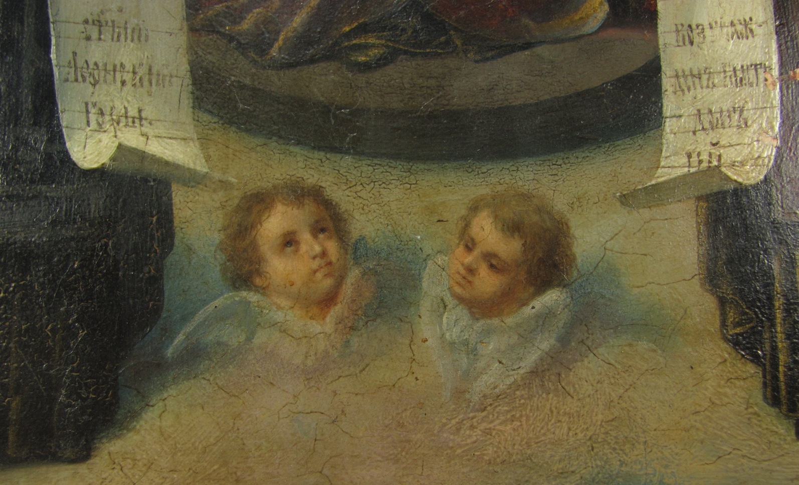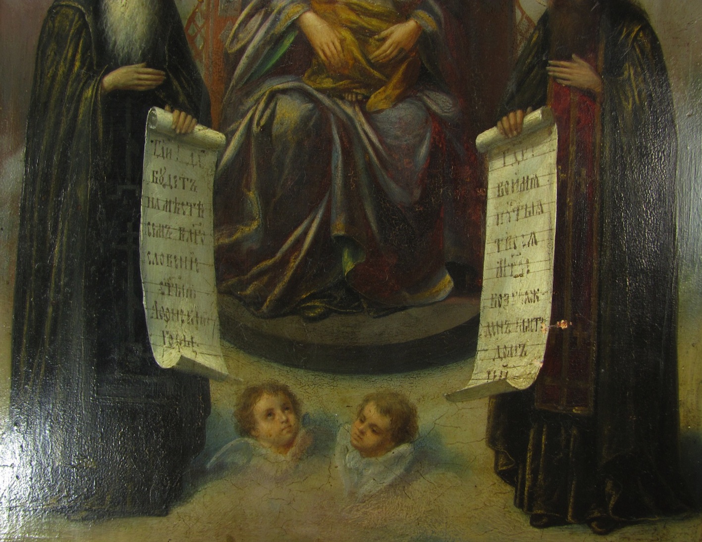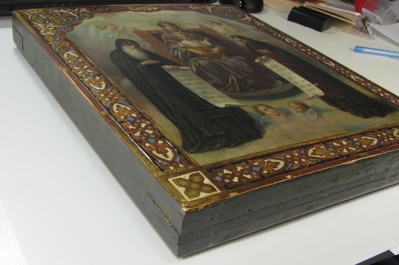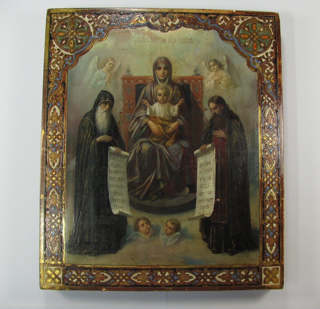 Золотофонка, резной ( гравированный) левкас. Без каких-либо вмешательств. Икона - БМ Печерская с предстоящими Антоний и Феодосий, написана иконописцем Тимофеем Вигуровым. Тимофей Вигуров работал в иконописной мастерской Николая Мурашко на Малой Житомирской.Кроме Трапезной,принимал участие в росписи Владимирского собора в бригаде М. В. Нестерова. Размер 31 см - 26.5 см - 3.5 см.