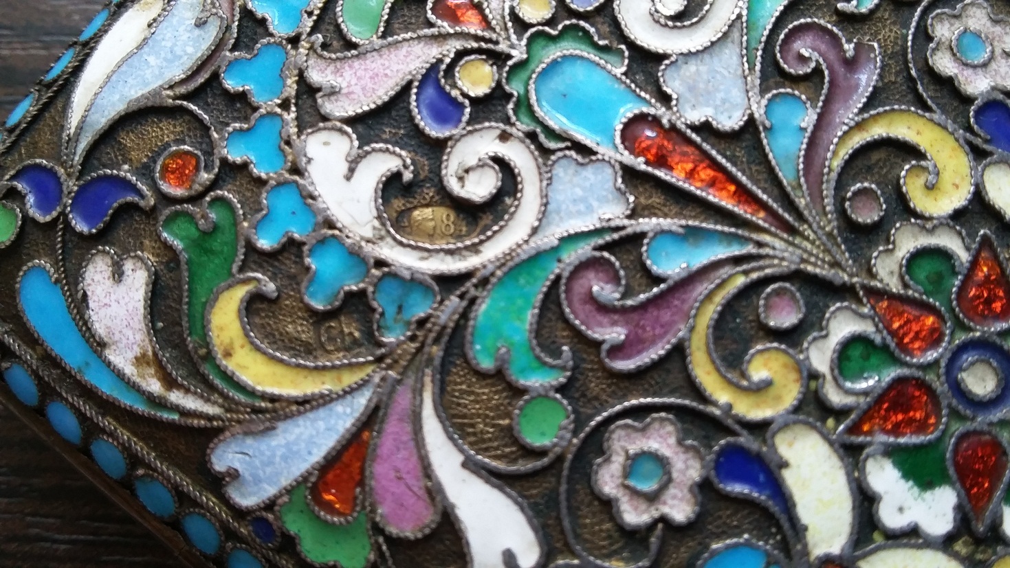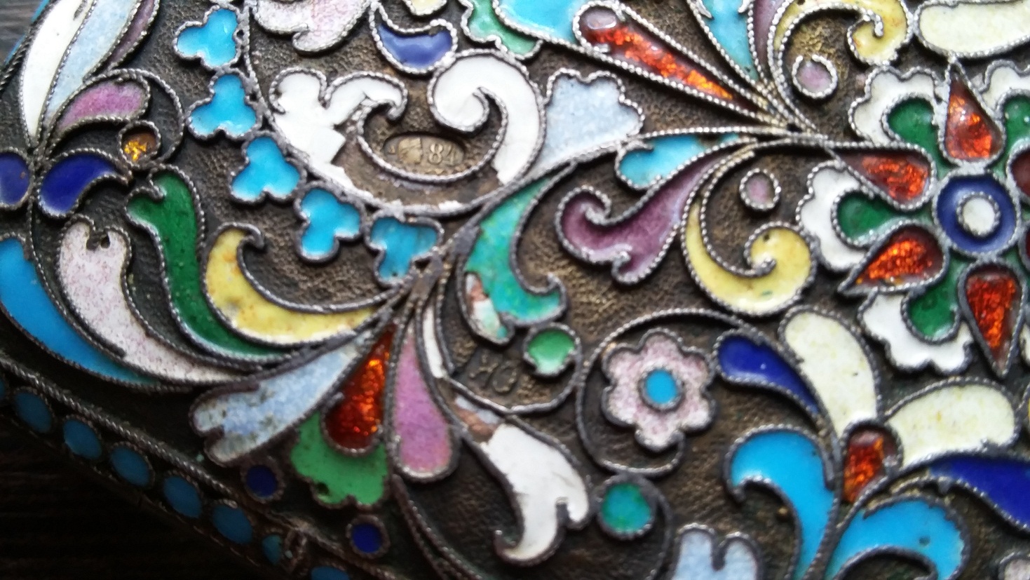 Серебро; полихромная эмаль по скани, золочение, камень синего цвета огранки «кабошон».
