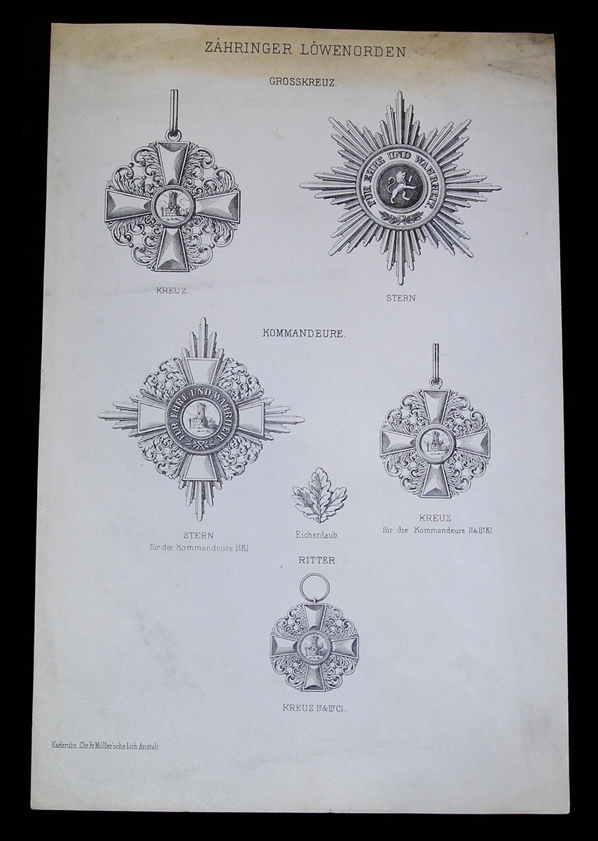 Лист с изображением всех степеней баденского Ордена Церингенского Льва. Размер 21,5 Х 33 см. Оборот чистый.