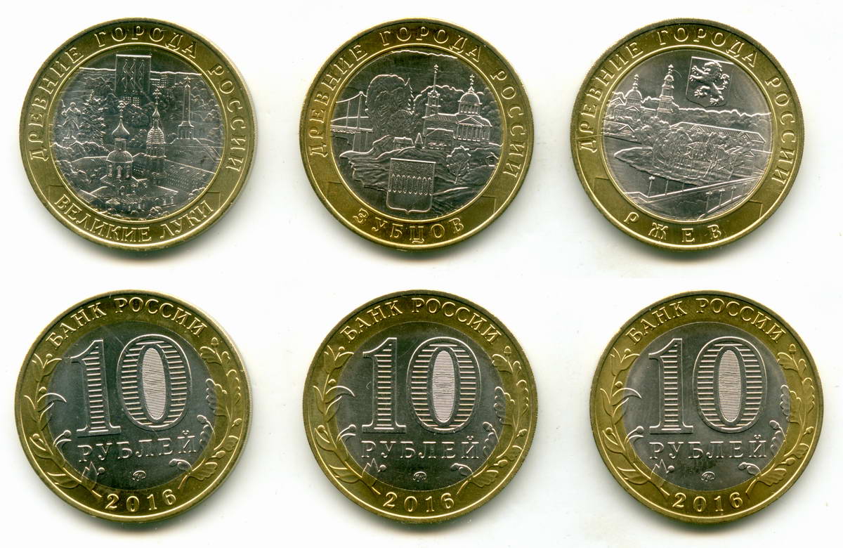 В наличие по 1 монете Великие Луки, Зубцов и Ржев. На гуртах отсутствует вдавленная надпись (10 рублей * 10 рублей *). Сканы реальных монет.