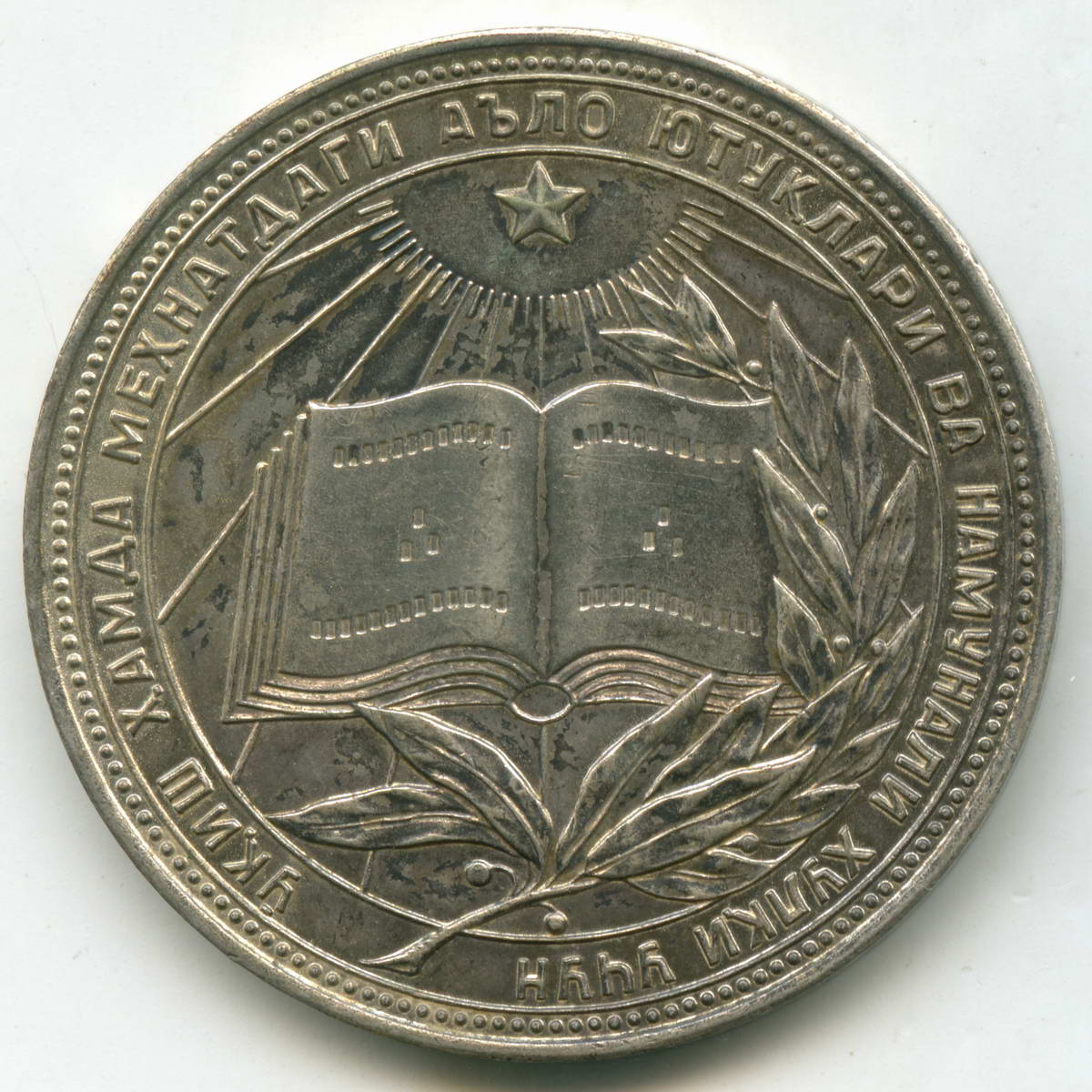 Состояние хорошее (серебрение незначительно потемнело), мелкие царапинки и забоинки присутствуют, но внешнего вида особо не портят. Следов поиска драгметаллов нет. Т.к. медаль с пескоструенной поверхностью, поэтому на скане видны светлые точки, вживую такого контраста нет...