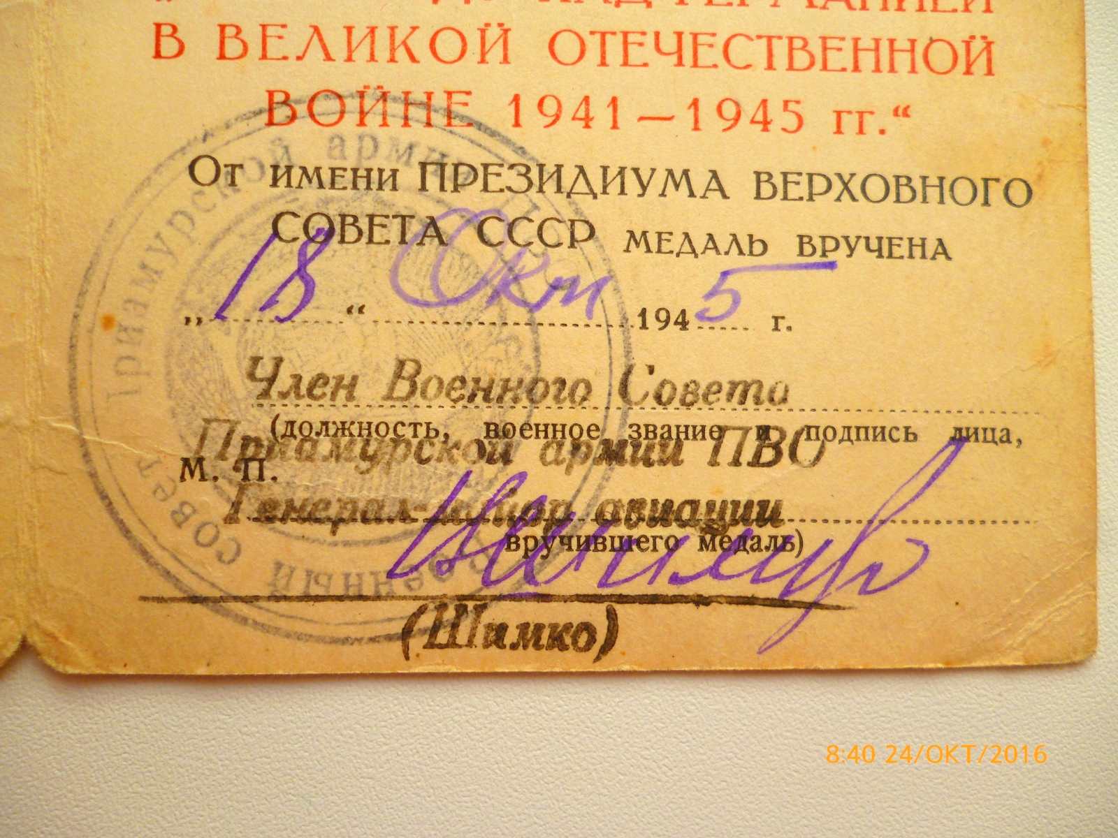 Приамурскую армию переименовали в Дальневосточную армию ПВО 29.10.1945.