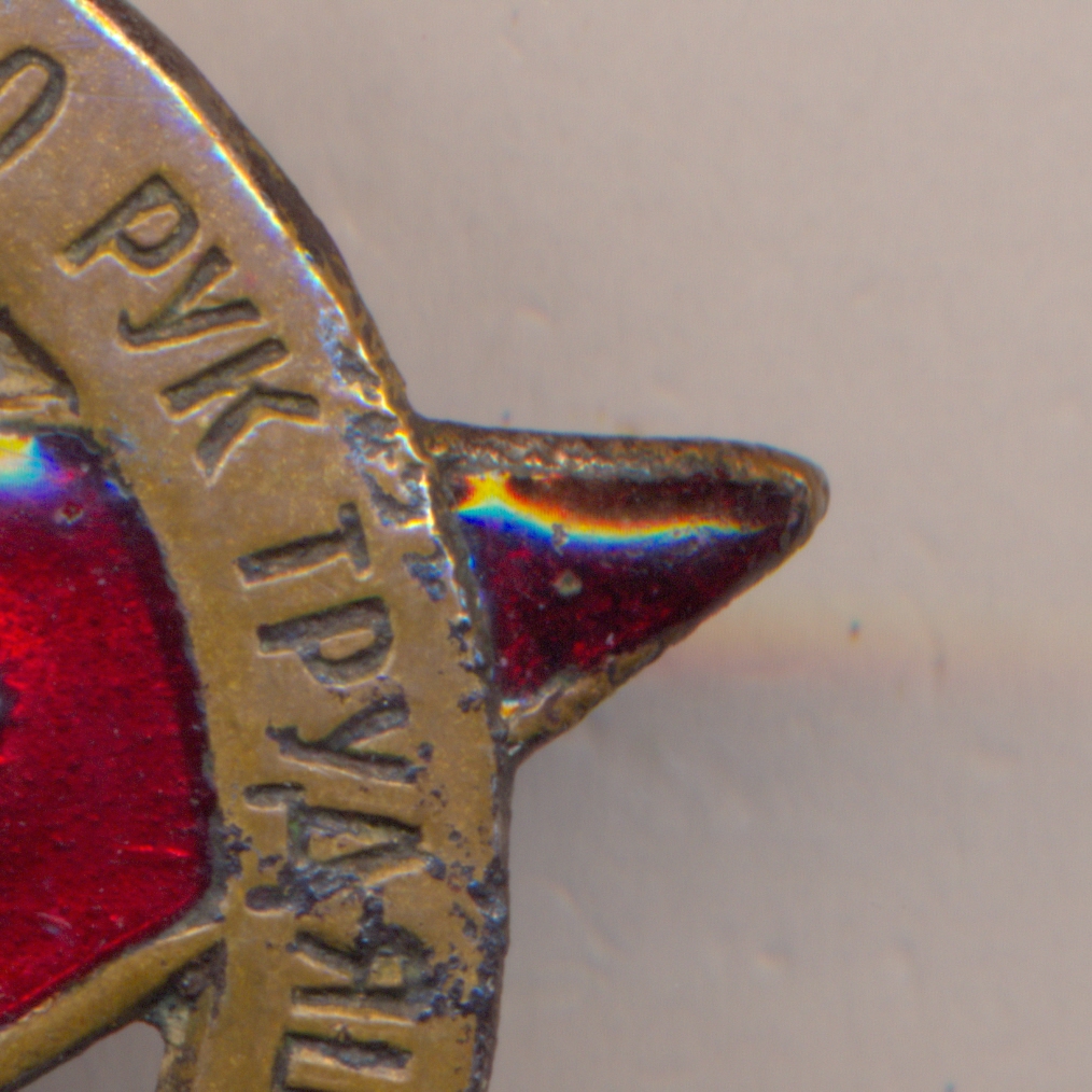 Сохранность очень хорошая. Незначительные следы ношения.По эмали : сколов,чешуек,трещин нет. Кончик Луча Звезды на 3 часа темнее чем остальная эмаль.( свечение под ультрафиолетом - однородное ). Эмаль или Переложена на кончике Луча или по какой-то причине темнее остальной.