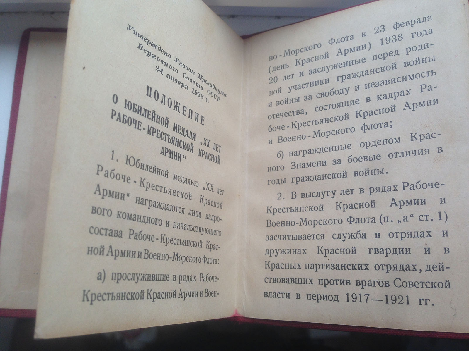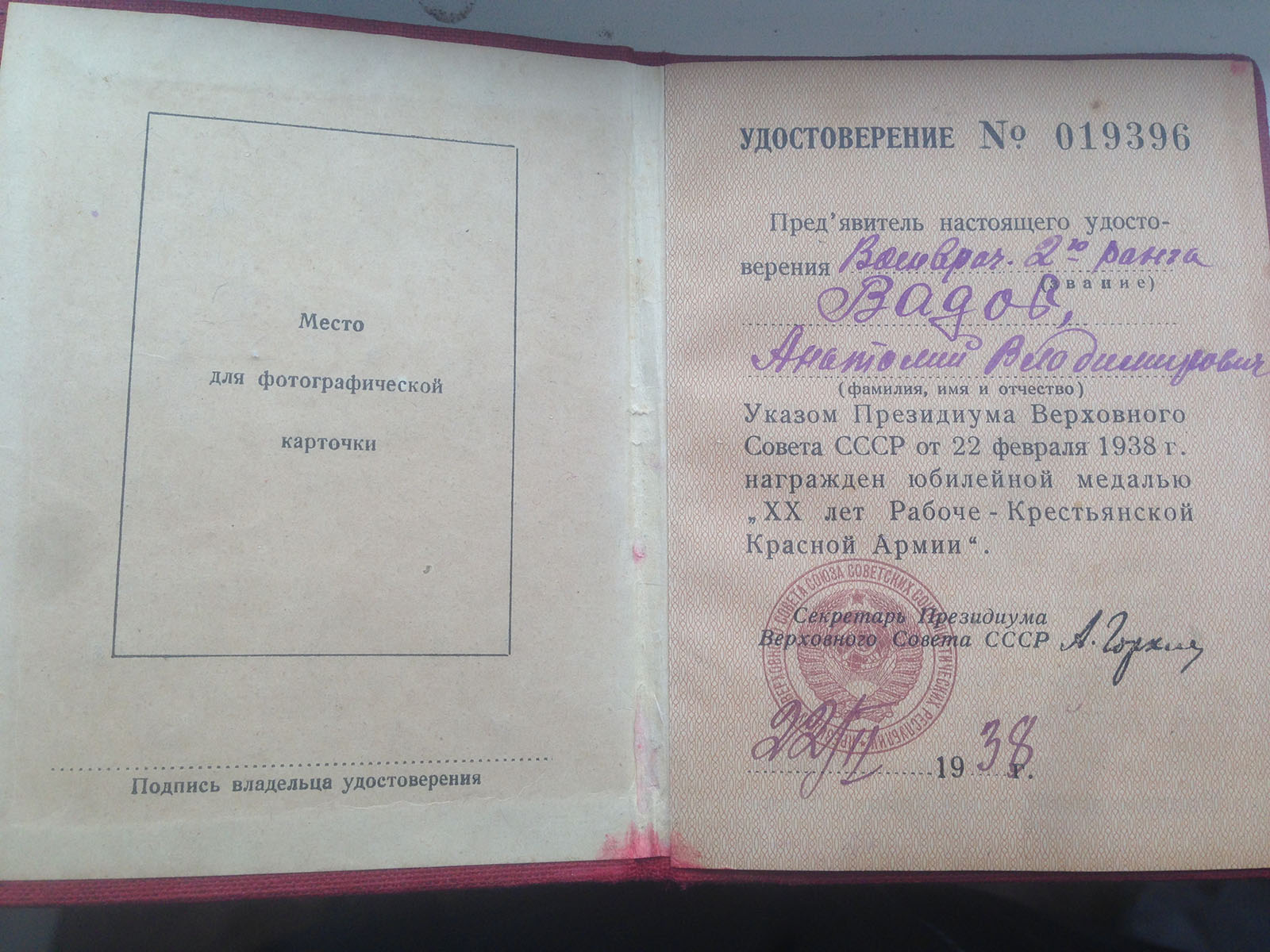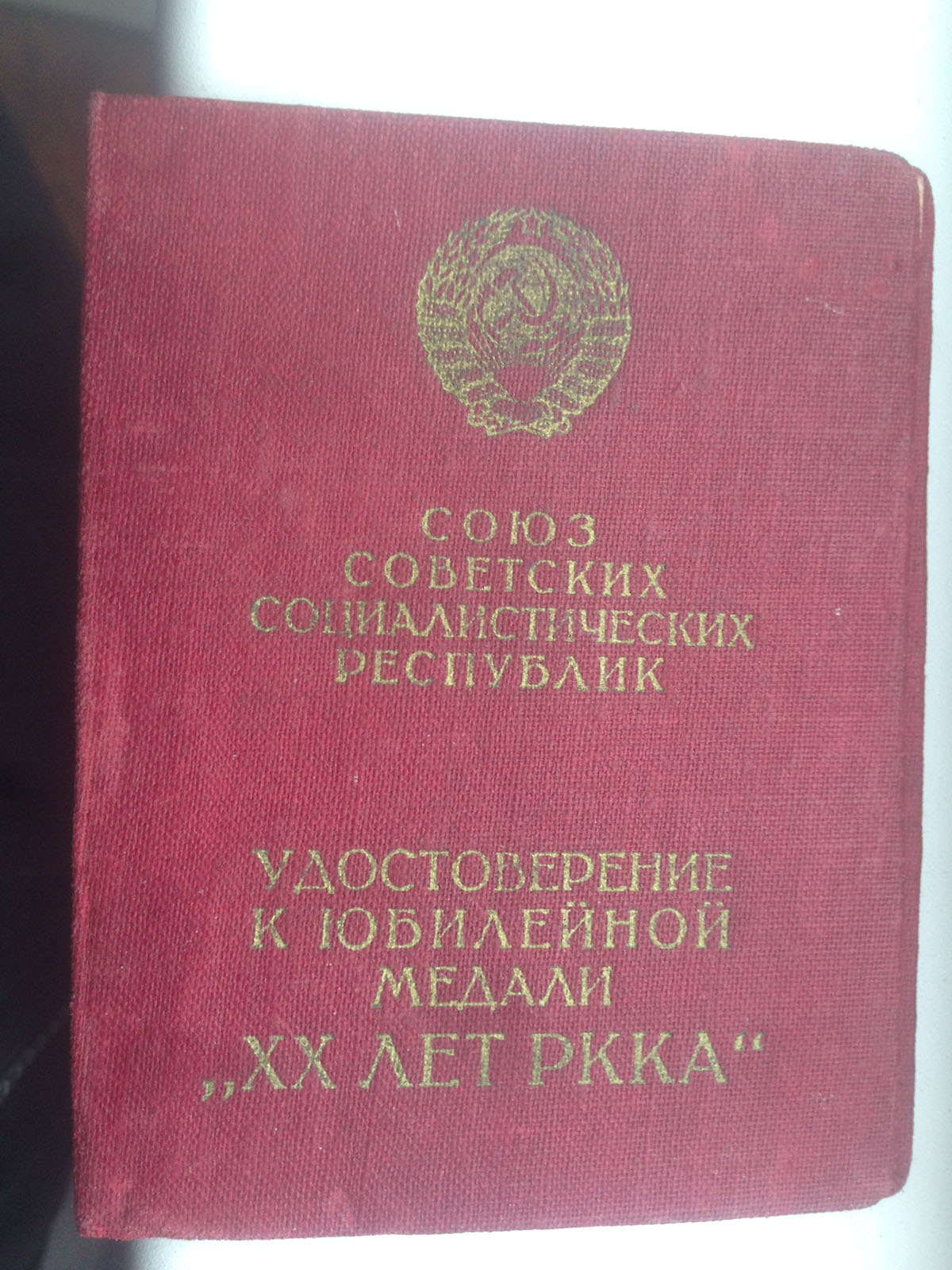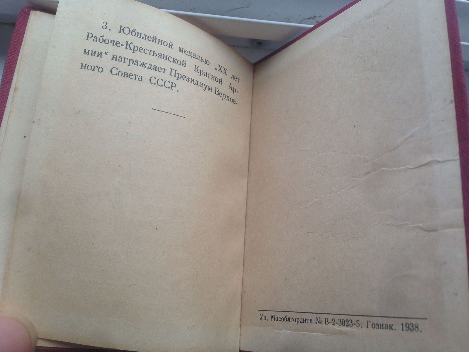 Документ на медаль " ХХ лет РККА" в очень хорошем состоянии без надрывов и потертостей.