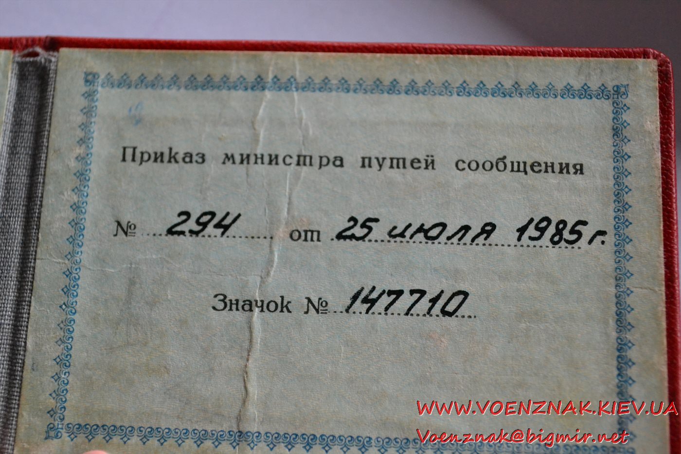 Удостоверение к знаку "Почетному железнодорожнику" № 294, периода СССР