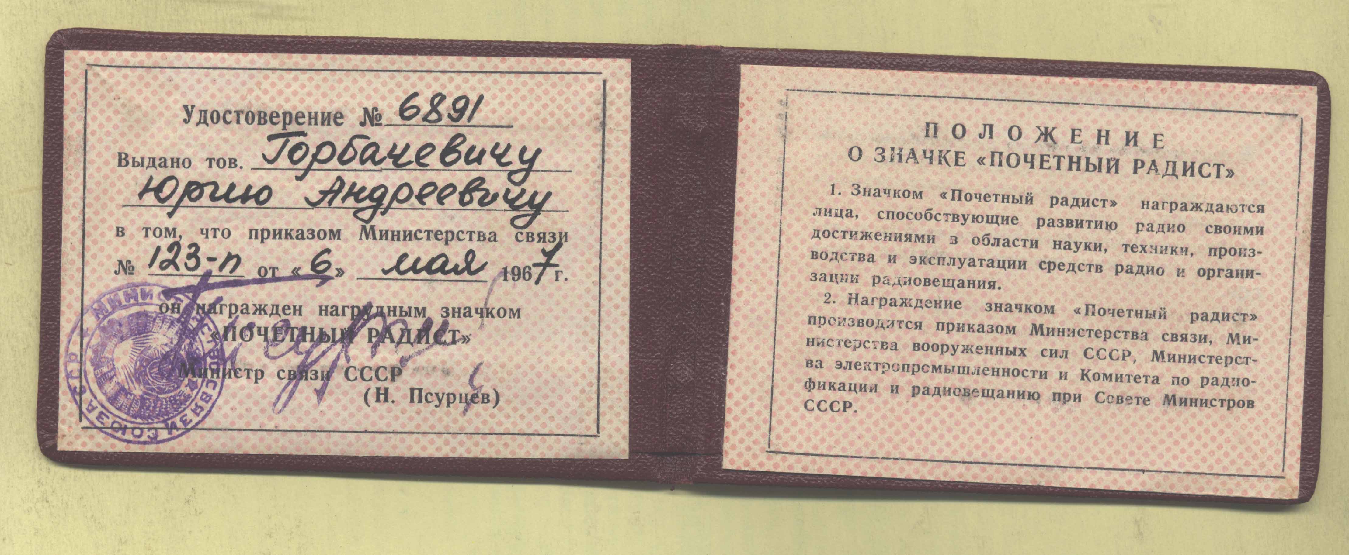 Удостоверение № 6891 от 06.05.1967 на Горбачевича Юрия Андреевича.