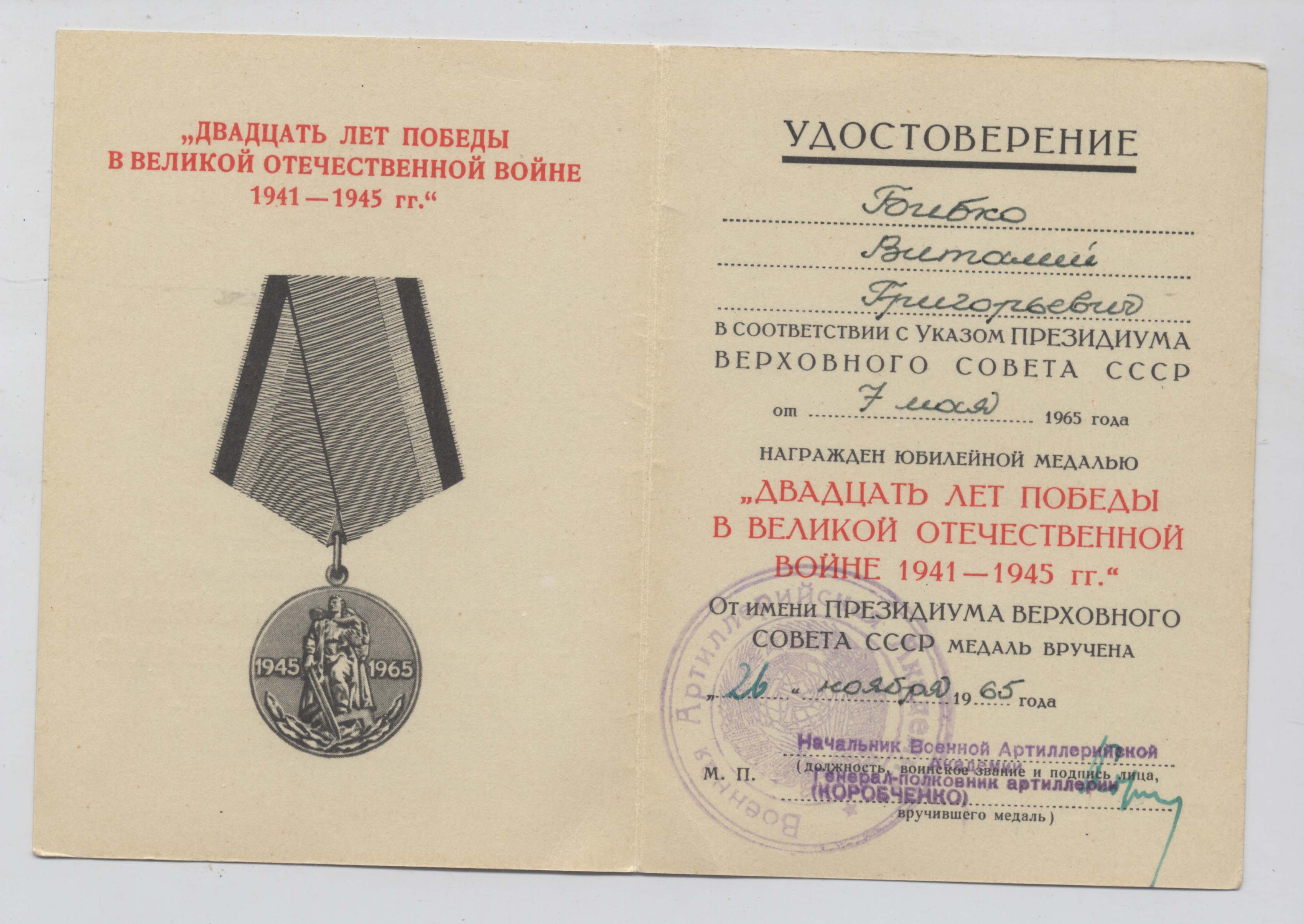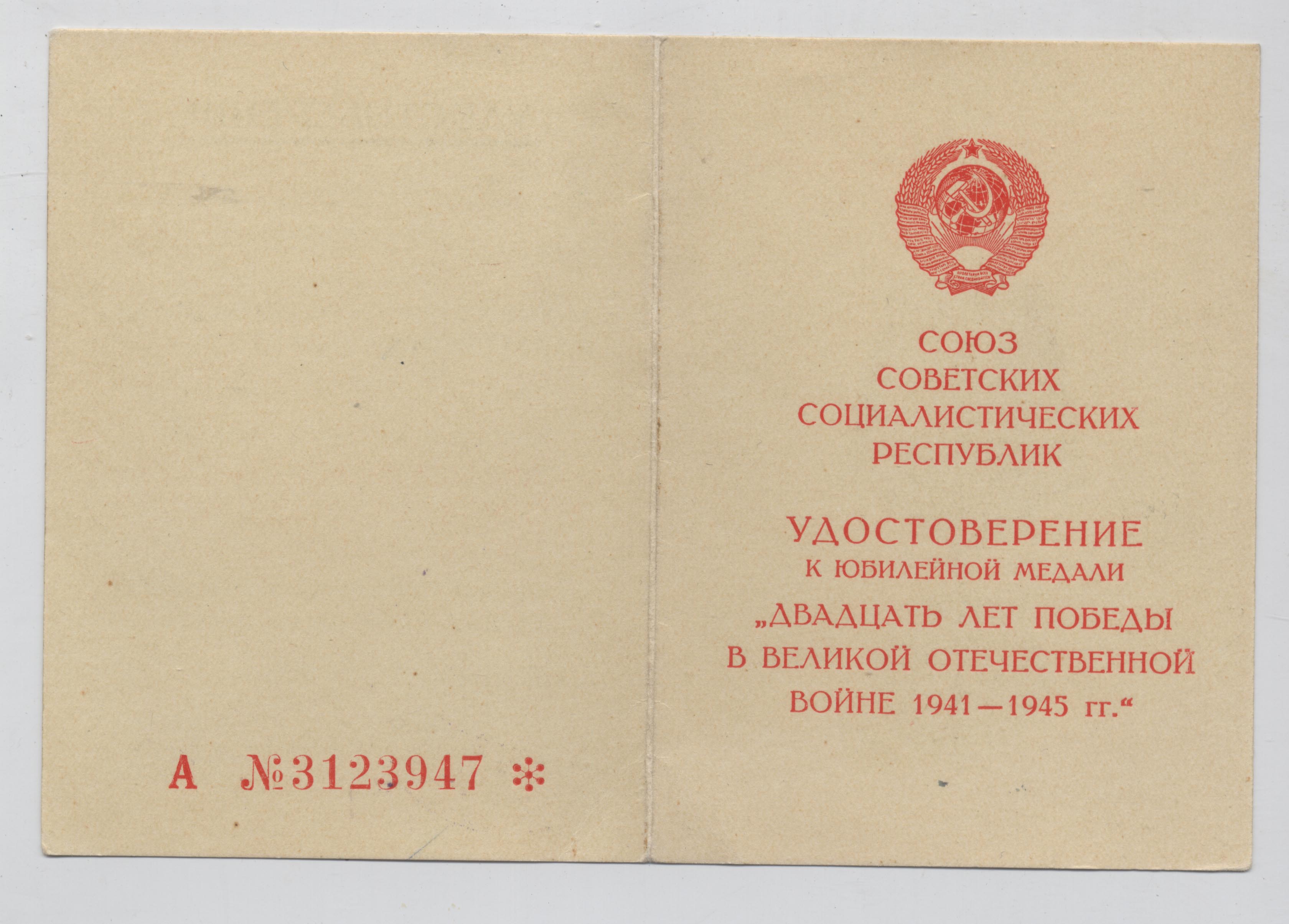 "20 лет победы в ВОВ" - А № 3123947 от 26.11.1965,
