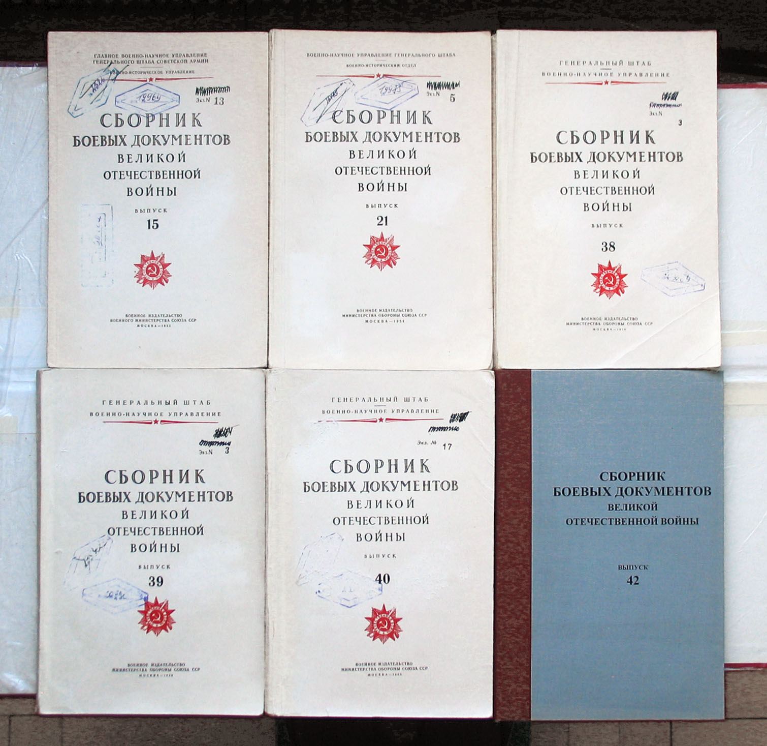 «Сборник боевых документов Великой Отечествен. войны.» - 6 выпусков: №15; 21; 38; 39; 40; 42. Гриф «Секретно». Издание: Военно-научное управление Генерального Штаба. Москва. Воениздат. 1952 –1960 годы. Все выпуски издавались в мягких обложках. У сборника №42 поверх родной, мягкой обложки сделан твердый переплет. У всех книг увеличенный, журнальный формат. Название всех сборников привожу ниже.