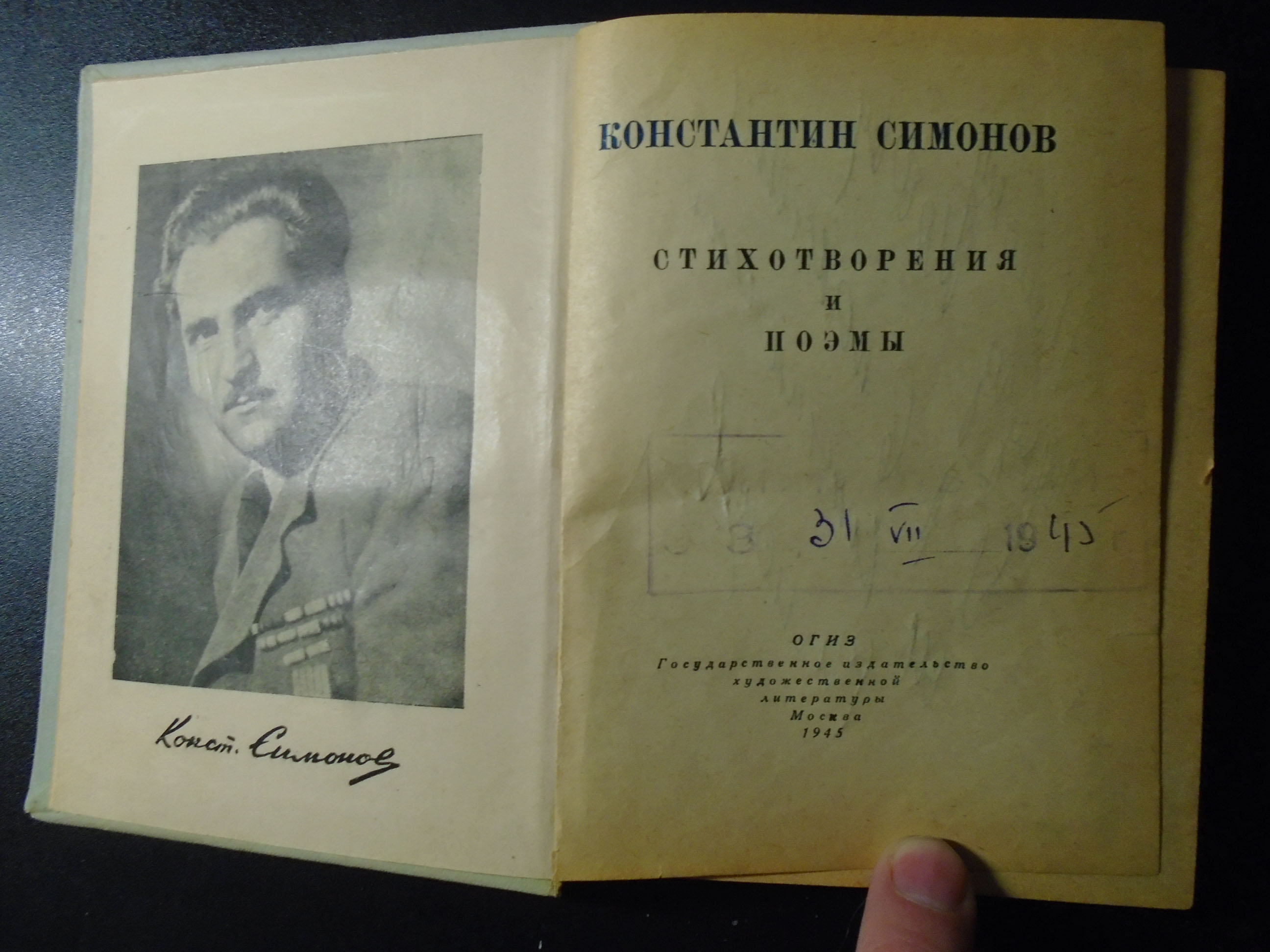 Содержание: Стихи военных лет. - Лирический дневник. - Из первых книг. - Главы из поэмы Первая любовь (1936-1941). - Суворов (1938-1939): Опала, Последний поход, Одиночество. Тираж 25000 экз. Автограф: `Милому другу ???ову И.А.(?) в память от Константина Симонов`. Константин (Кирилл) Михайлович Симонов (28 ноября 1915, Петроград — 28 августа 1979, Москва) — русский советский прозаик, поэт, киносценарист, журналист и общественный деятель, Герой Социалистического Труда (1974), лауреат Ленинской (1974) и шести Сталинских премий (1942, 1943, 1946, 1947, 1949, 1950). Участник боев на Халхин-Голе (1939) и Великой Отечественной войны 1941—1945 годов, полковник Советской Армии, заместитель генерального секретаря Союза писателей СССР.