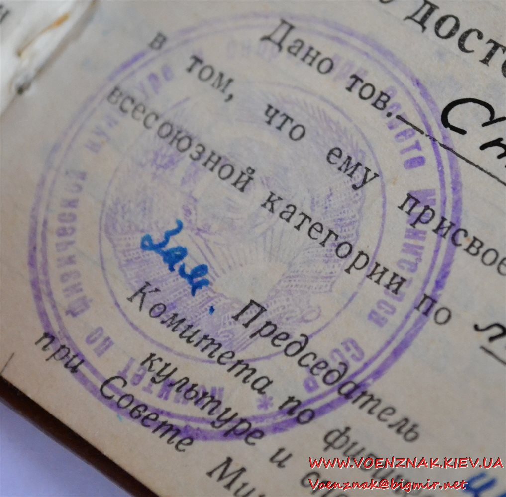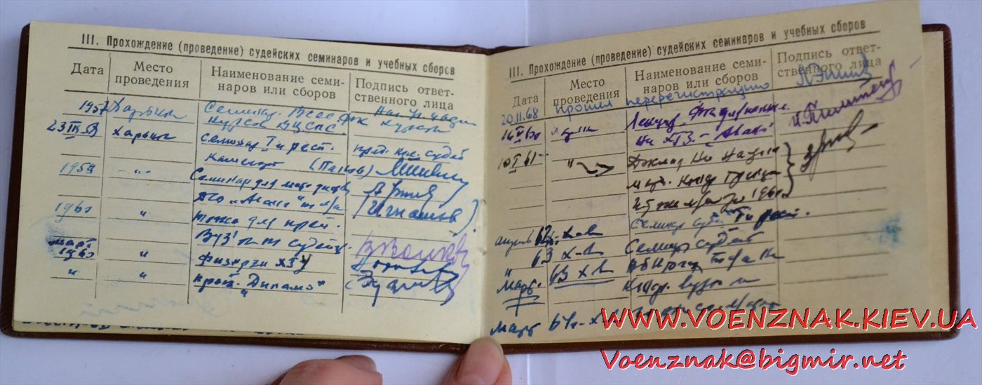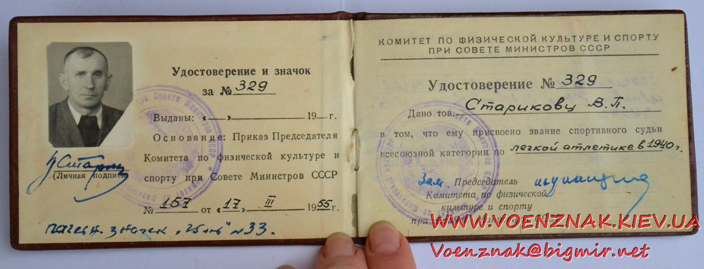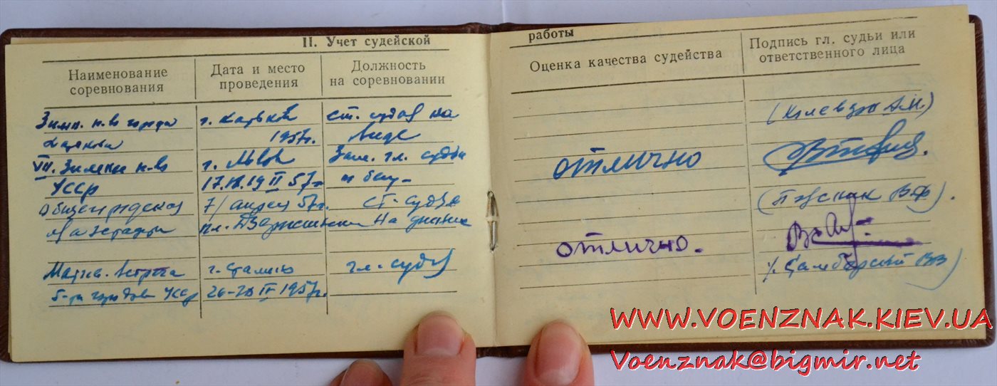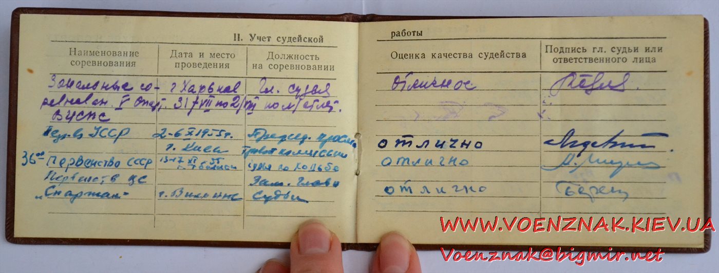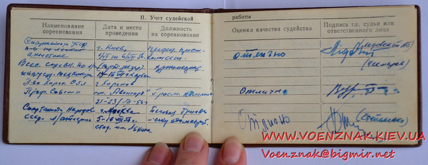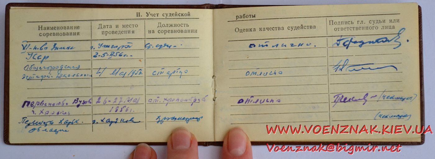 Удостоверение "Судья по спорту всесоюзной категории" (легкая атлетика). Записи судьи с 1955 по 1961 гг.
