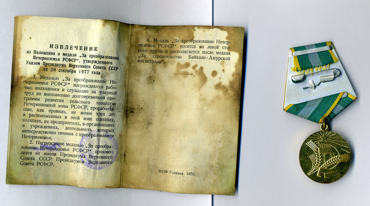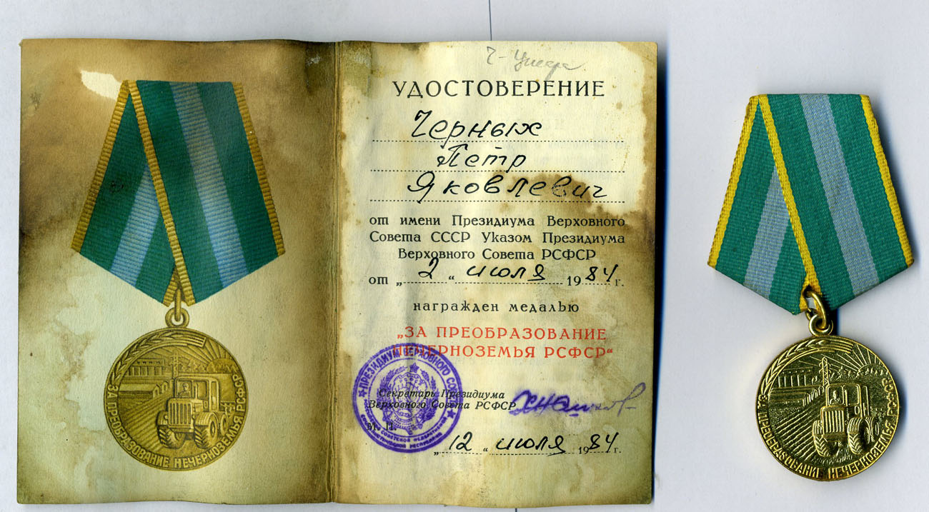 Медали Серп и Молот, За Трудовую Доблесть, За Трудовое Отличие, За Доблестный Труд в Великой Отечественной Войне,За Восстановление Предприятий Чёрной Металлургии Юга, За Восстановление Угольных Шахт Донбасса, За Освоение Целинных Земель, За Строительство БАМ, За Преобразование Нечерноземья РСФСР, За Освоение Недр и Развитие Нефтегазового Комплекса Западной Сибири, Ветеран Труда