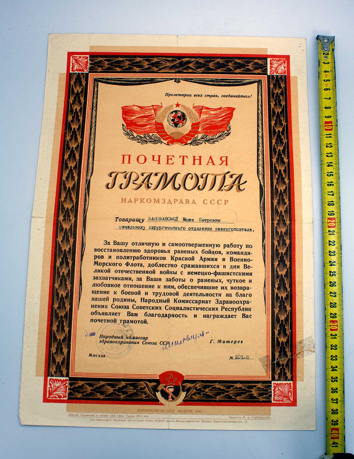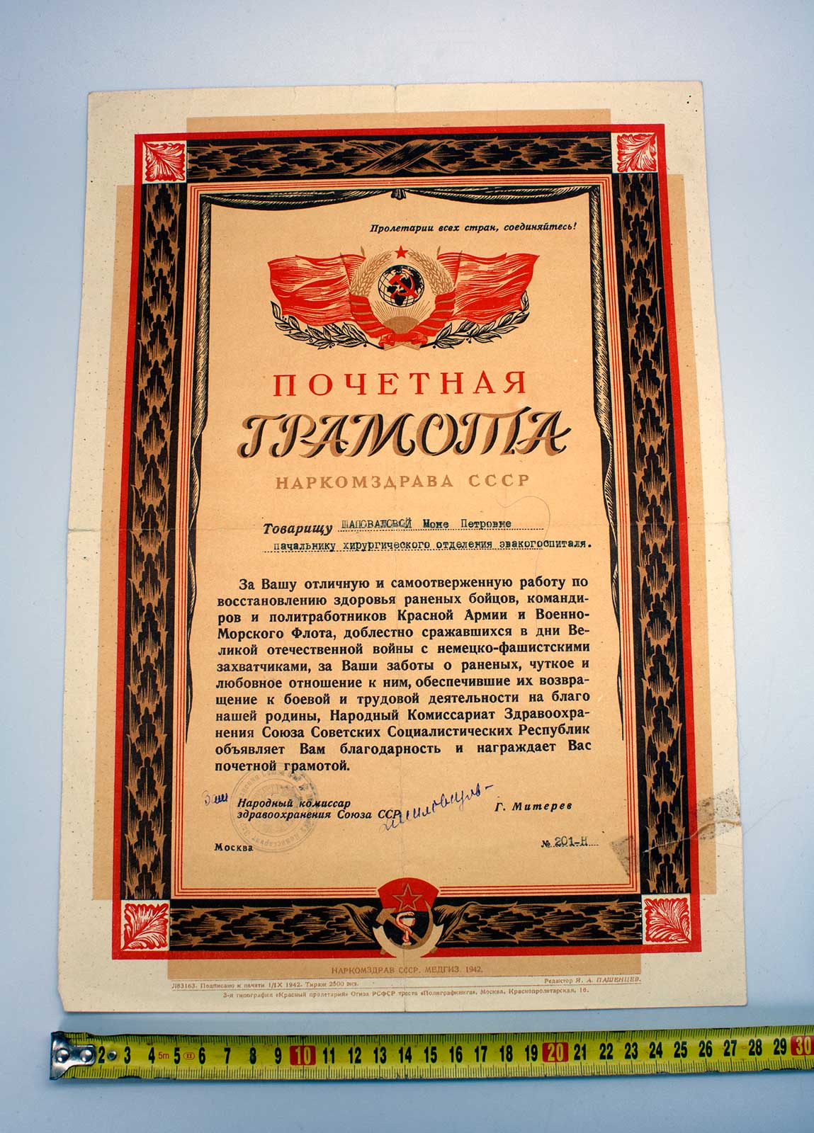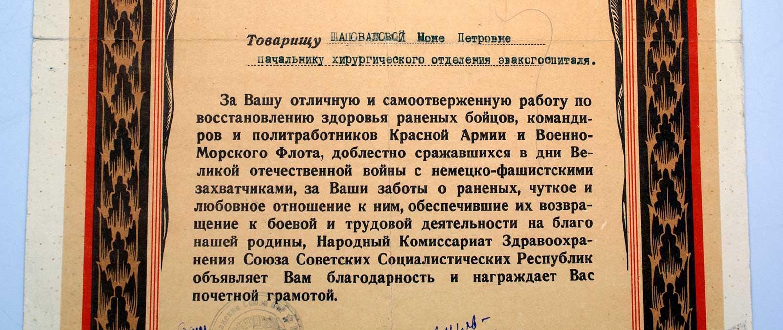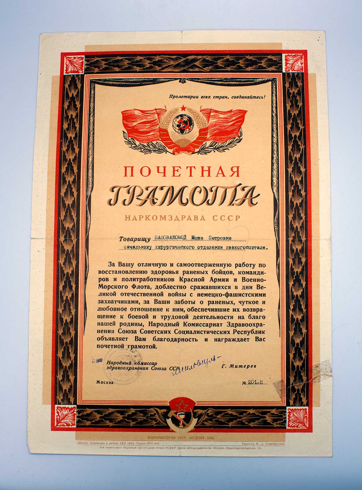 Грамота от НАРКОМЗДРАВА на эвакогоспиталь 1942г оч. КРАСИВАЯ