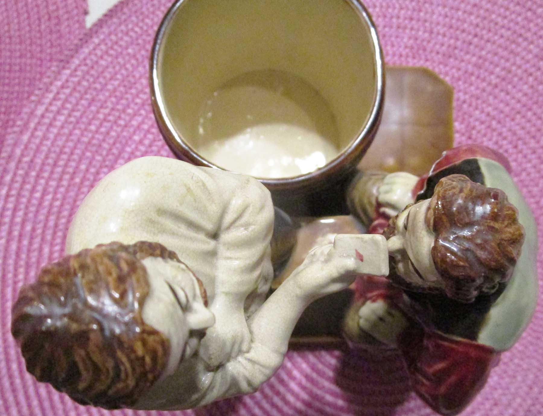 Сохранилась крышечка бочонка , что вообще крайне редко бывает у таких композиций , права была расколота. реставрировали.