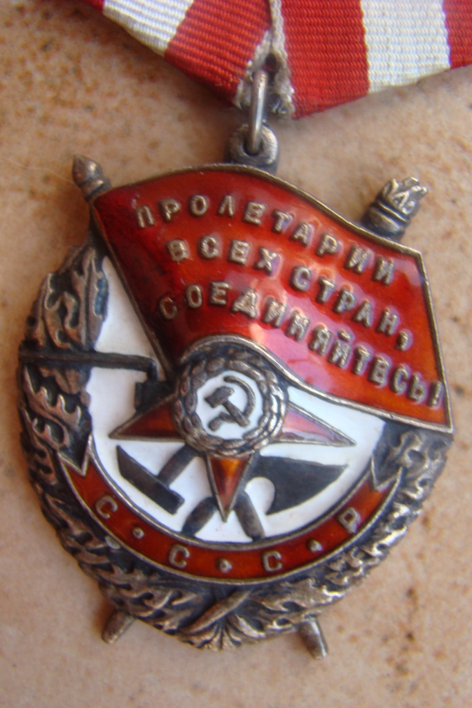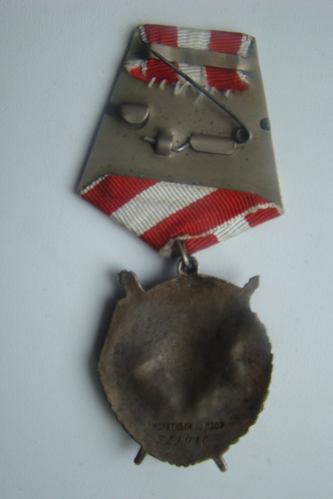 Орден № 322080. Родная колодка, двуслойная. Промзвено раскушено. На знамени у древка подмазка.