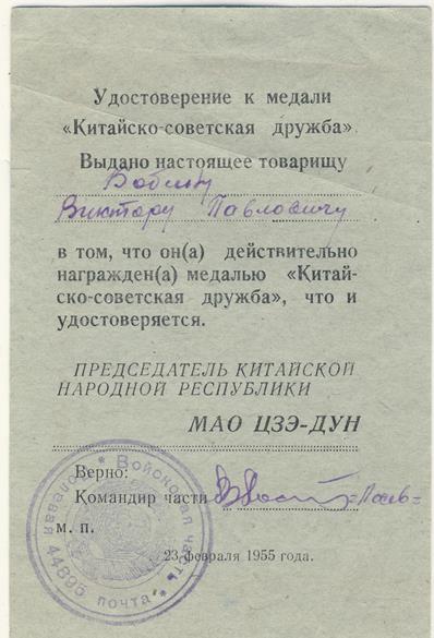 документ на медаль Китайско-Советской дружбы s_m_s - 13 фев 2017 16:30.30 × Мини профиль пользователя s_m_s Сообщения: 9926 Зарегистрирован: 11 авг 2005 12:23.18 Откуда: 35 RUS Статус: Не в сети - 13 фев 2017 16:30.30 #5914590 состояние на скане, шелк практически в идеале, при необходимости доп сканы на почтупредлагайте в л/с Фото