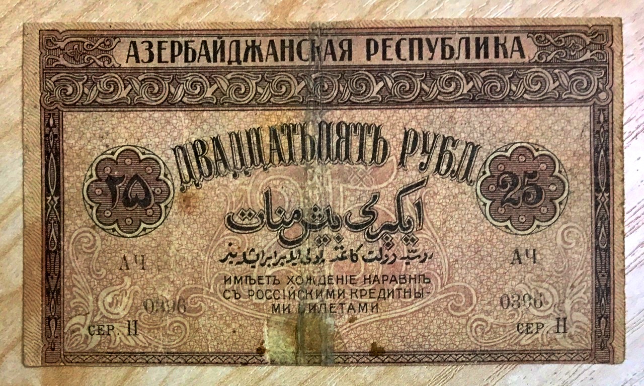 25 рублей 1919 года. Айзербаджан. ДВАДЦАТЬПЯТЬ с ошибкой. Dmitriy64 - 19 апр 2017 11:03.33 × Мини профиль пользователя Dmitriy64 Сообщения: 38234 Зарегистрирован: 04 мар 2007 11:20.44 Статус: Не в сети - 19 апр 2017 11:03.33 #5985321 напомню