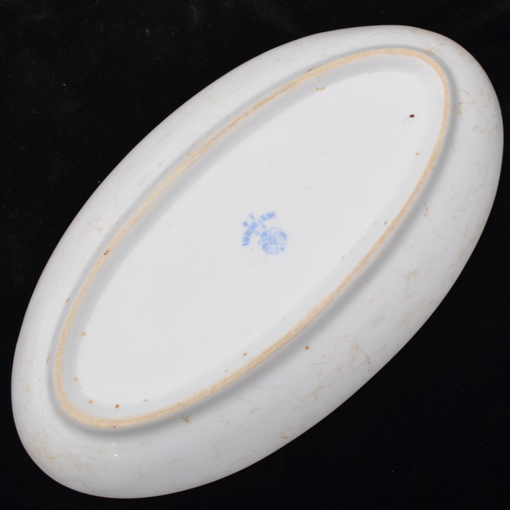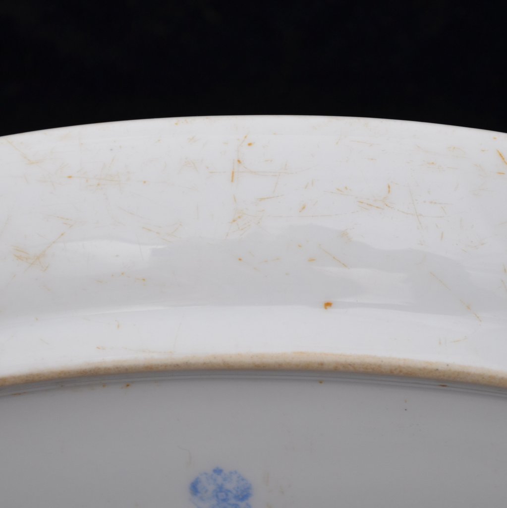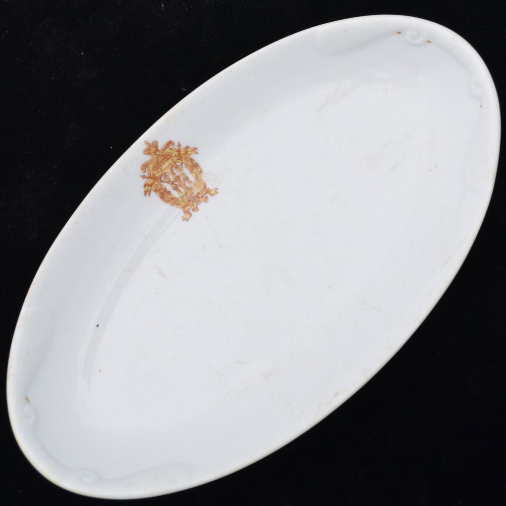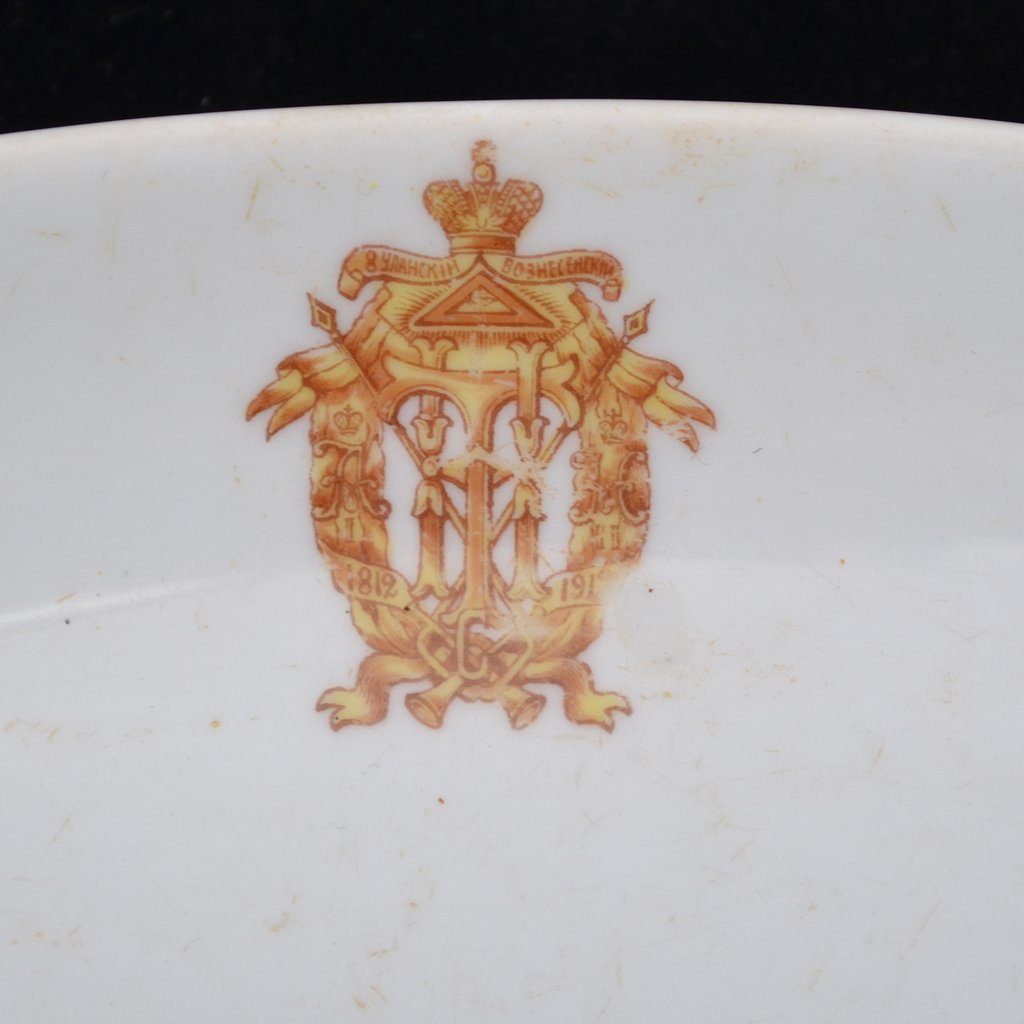 Оригинальная селедочница в неплохом коллекционном состоянии. Фарфор, деколь. Размер 148*265 мм. В конце XIX – начале ХХ вв. офицерское собрание войсковой части было для военнослужащих своего рода клубом, где они могли столоваться, отмечать праздники и проводить досуг вместе с семьями, что было особенно актуально для гарнизонов малых городов и местечек. Существовала должность хозяина офицерского собрания, которую обычно занимал опытный в хозяйственных делах офицер, следивший за порядком и контролировавший хозяйственную деятельность. Каждое собрание заказывало для себя посуду, выдержанную в корпоративных цветах войсковой части и, как правило, снабженную соответствующей атрибутикой. В данном случае таким атрибутом является полковой знак, учрежденный в 1912 году, что обуславливает нижнюю границу датировки. Верхней границей может быть назван 1914 год, когда с началом Первой Мировой войны атрибутика мирного времени практически исчезла из обихода частей, отправлявшихся на фронт. Селедочница без сколов, однако имеет ряд царапин по периметру, особенно хорошо заметных на оборотной стороне. Гарантия подлинности.