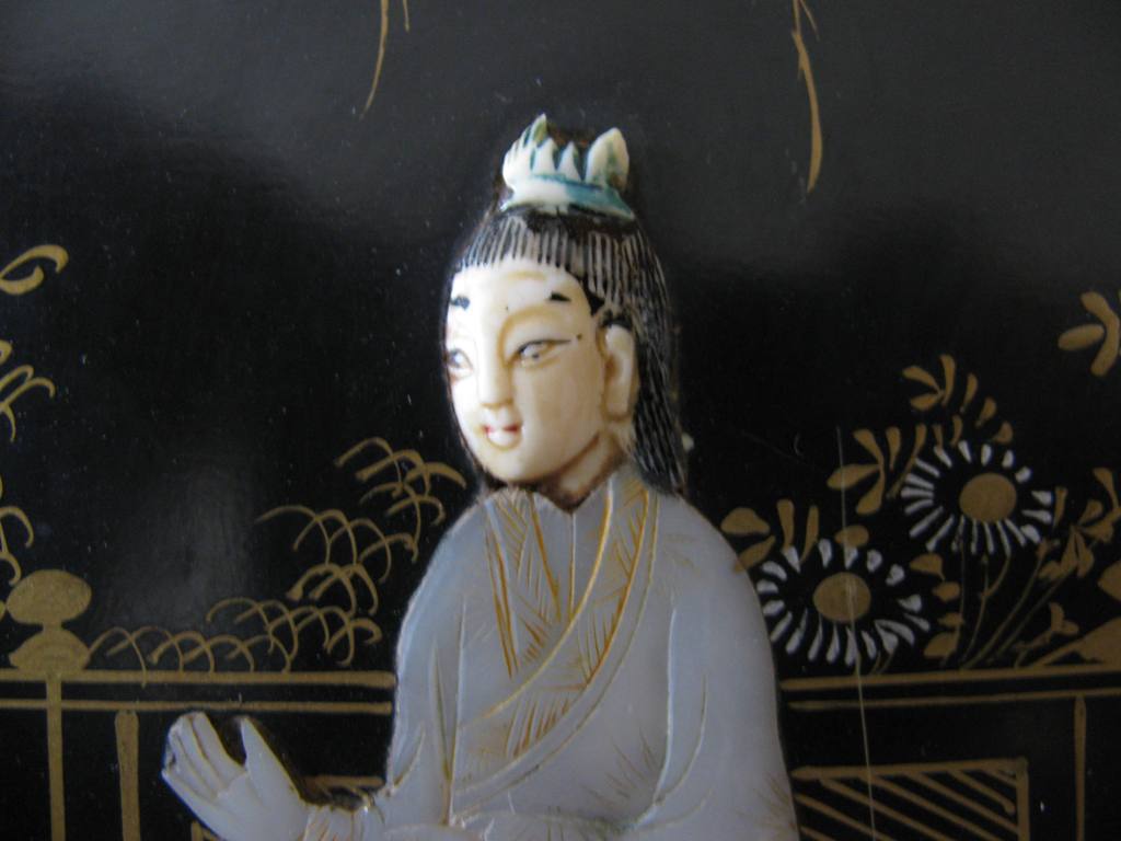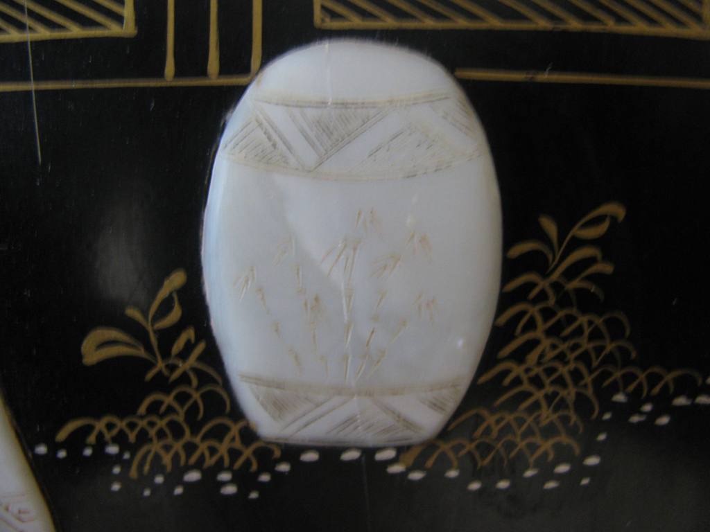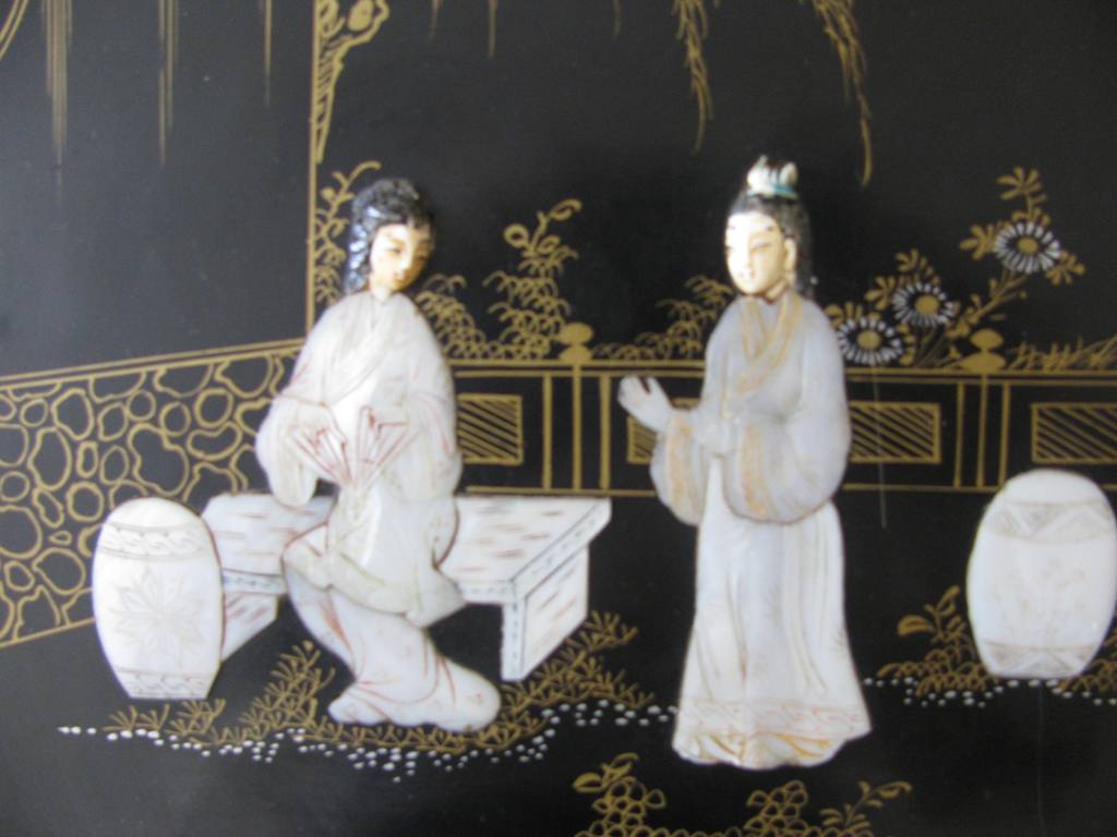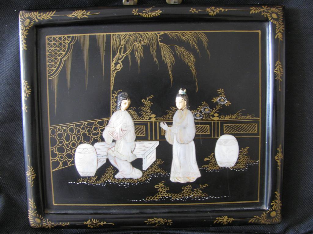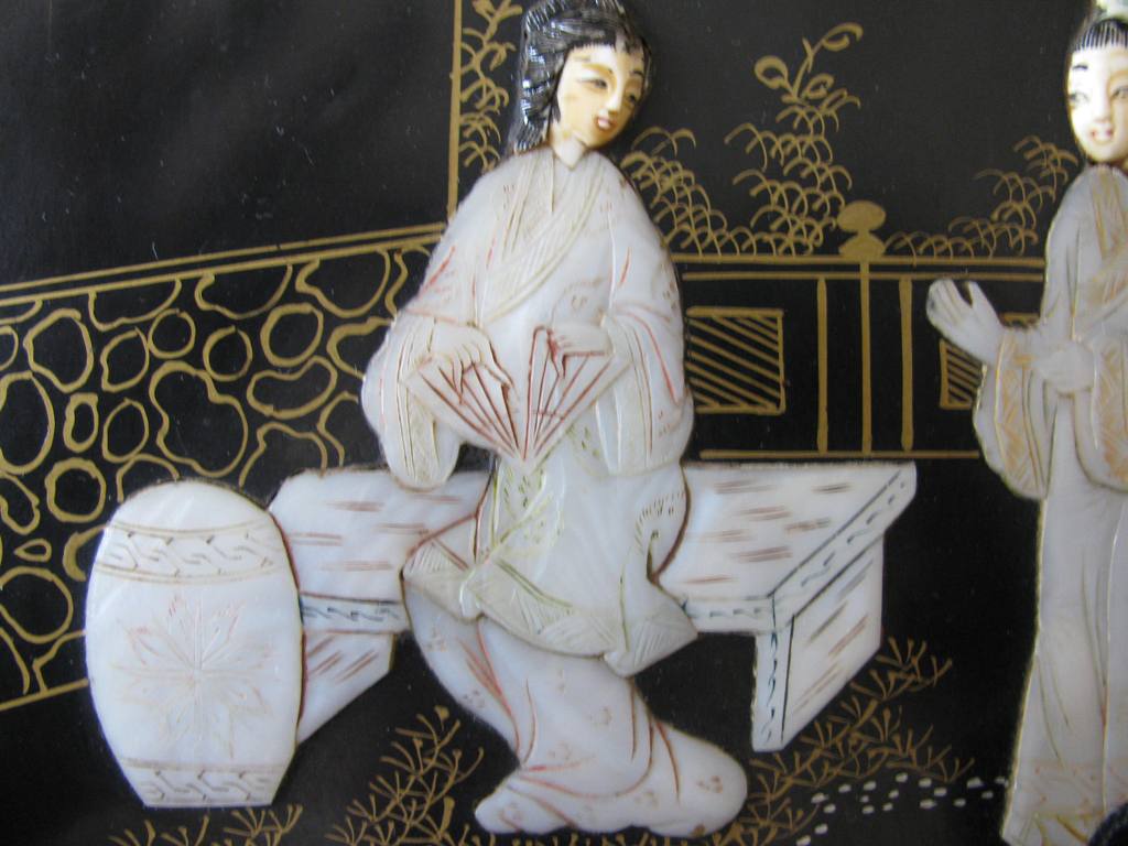 Панно,резьба по речной ракушке-жемчужницы.Китайские старинные мотивы.Размер-21х25 см.Роспись золотом,очень эффектная вещица,отличный подарок. Почта на покупателе. МПЦ-5 тыс. рублей.
