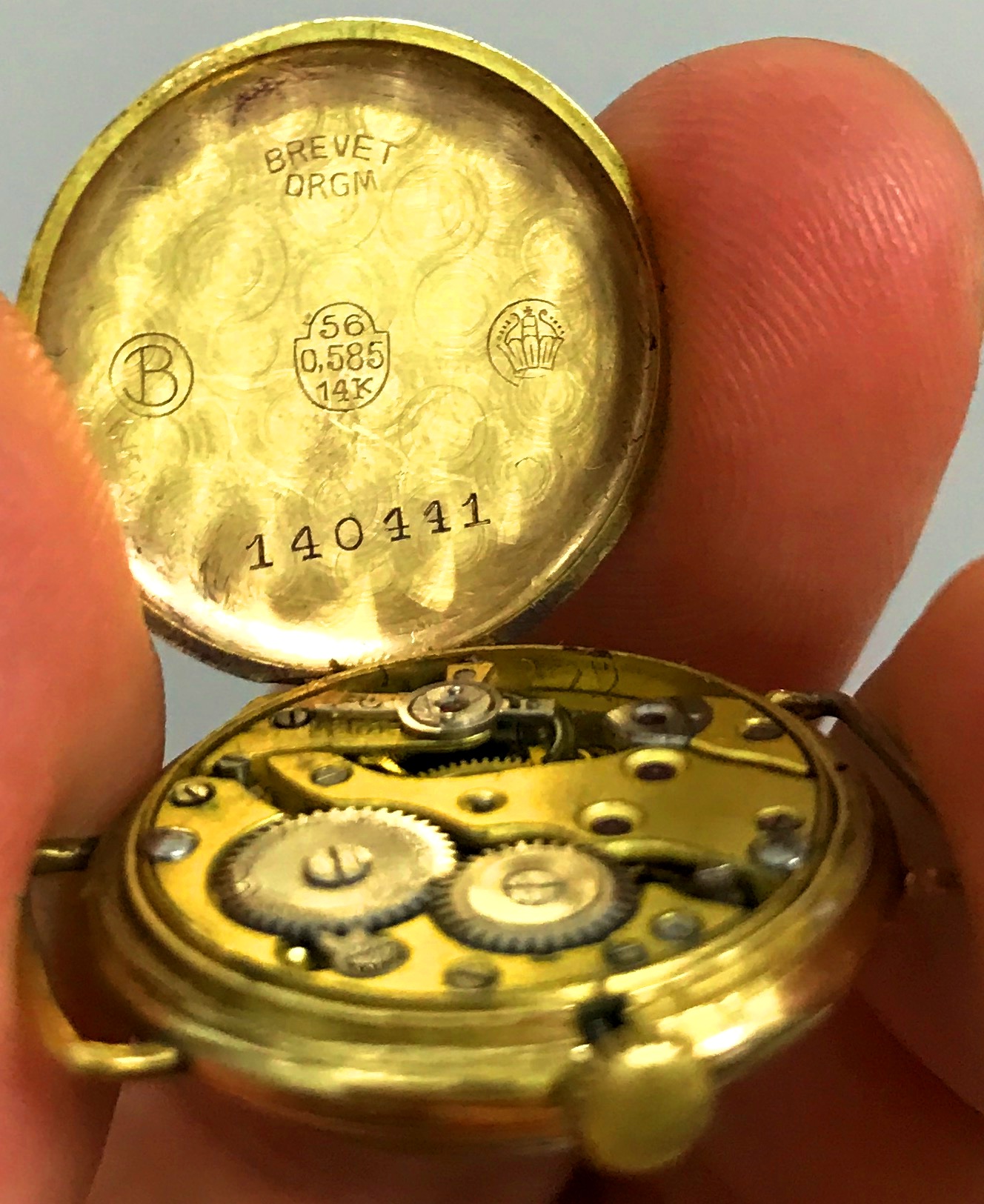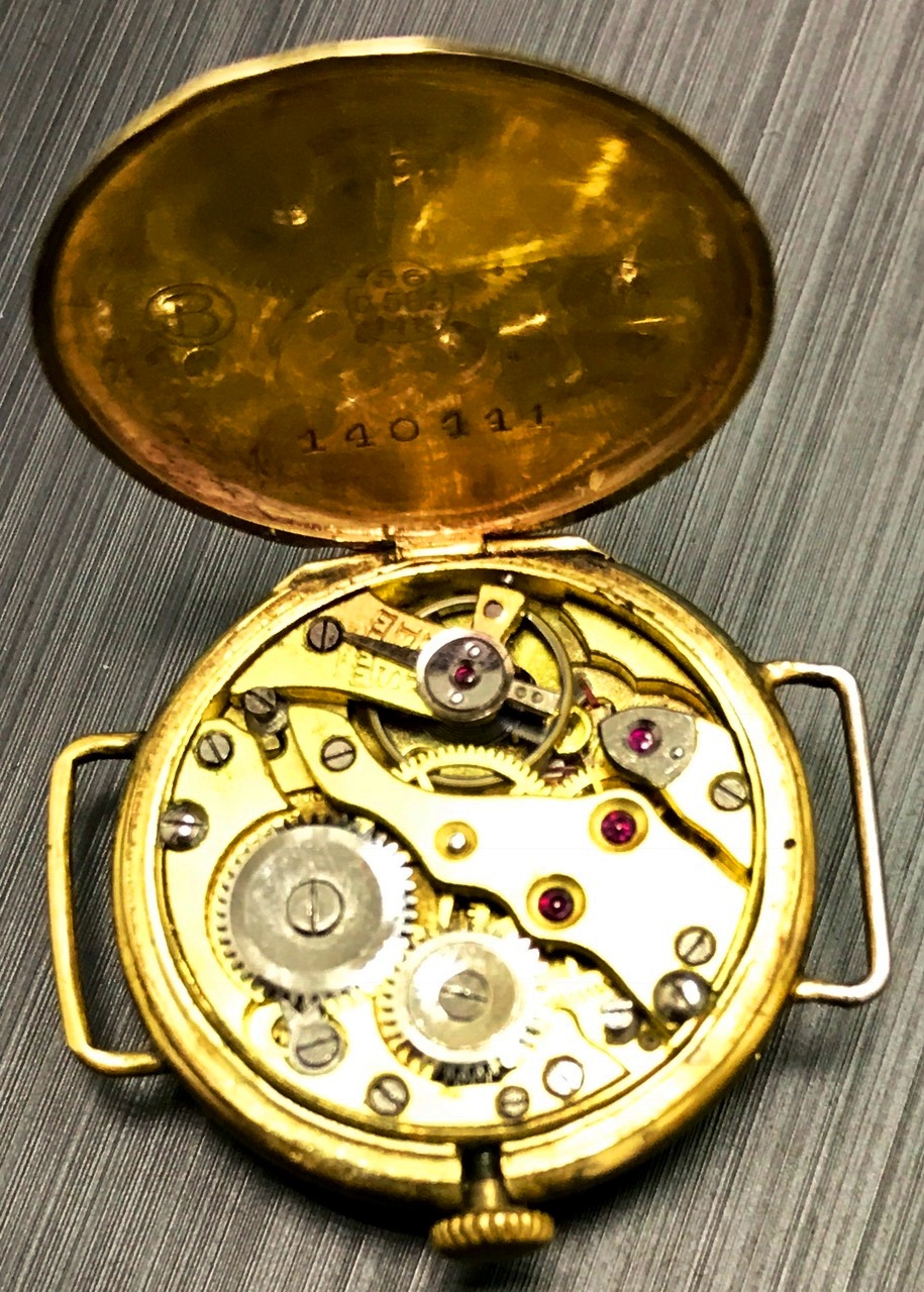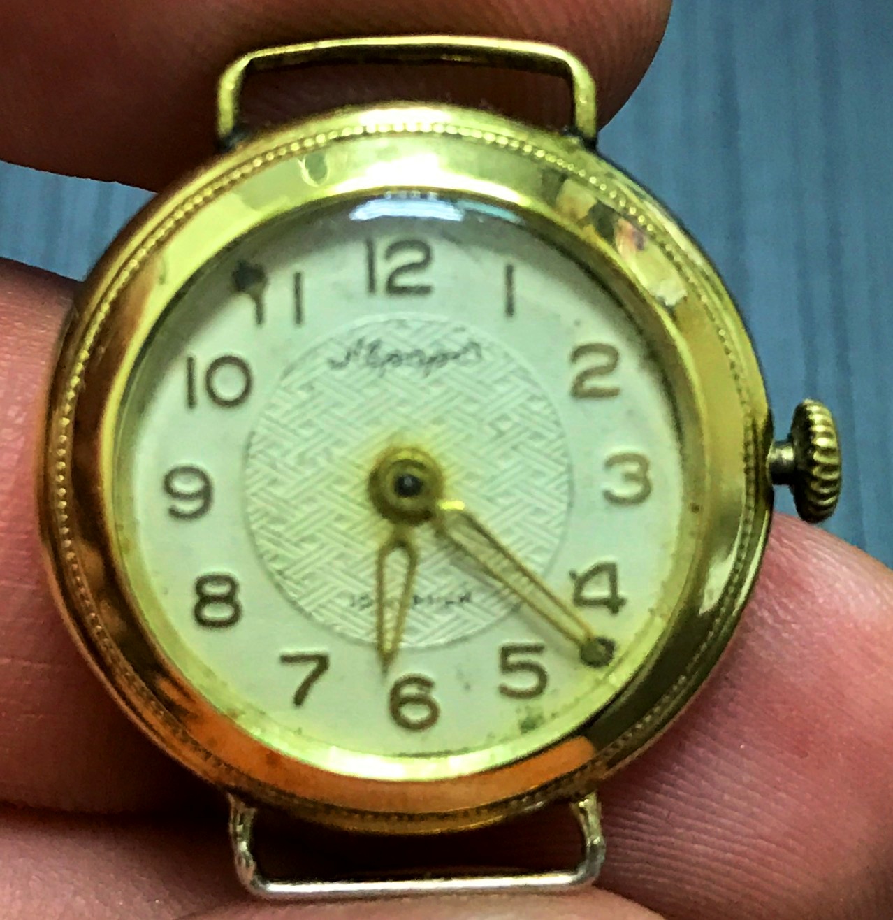 Часы на ходу. Но механизм и циферблат не родные. В корпус вставили советские часы АВРОРА. Вес золота без меха и стекла - 3 грамма.
